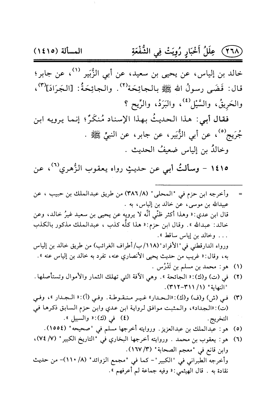 ١٤١٥ - وسألتُ أَبِي عَنْ حديثٍ رَوَاهُ يعقوب الزُّهري (٦) ، عن