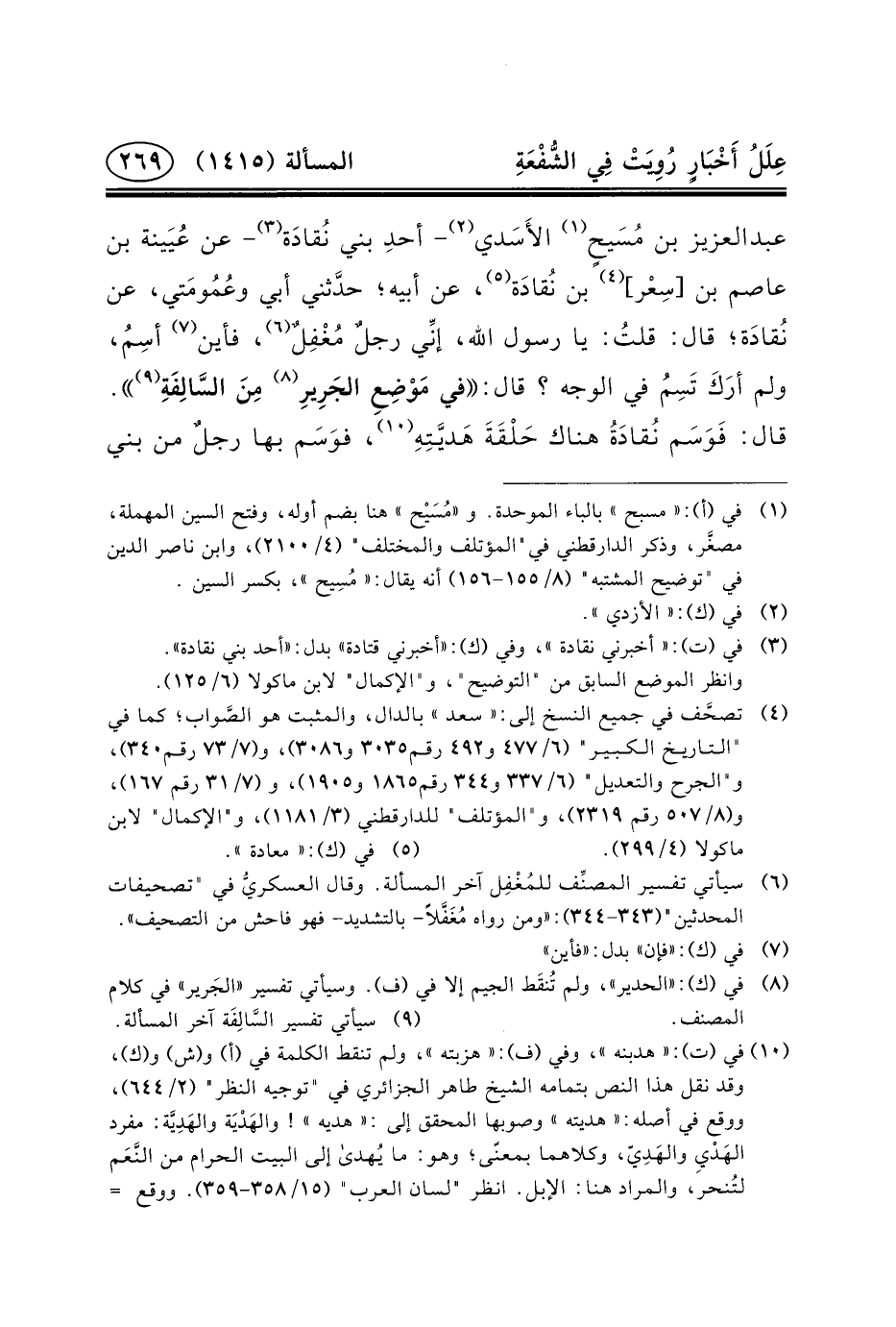 - عَنْ عُيَينة بْنِ عَاصِمِ بن [سِعْر] (٤) بْنِ نُقادَة (٥) ، عَنْ أَبِيهِ؛ حدَّثني أَبِي وعُمُومَتي، عَنْ نُقادَة؛ قَالَ: قلتُ: يَا رَسُولَ اللَّهِ، إنِّي رجلٌ مُغْفِلٌ (٦) ، فَأَيْنَ (٧) أسِمُ، وَلَمْ أرَكَ تَسِمُ فِي الْوَجْهِ؟ قَالَ: فِي مَوْضِعِ الجَرِيرِ (٨) مِنَ السَّالِفَةِ (٩) . قَالَ: فَوَسَم نُقادَةُ هُنَاكَ حَلْقَةَ هَديَّتِهِ (١٠) ،