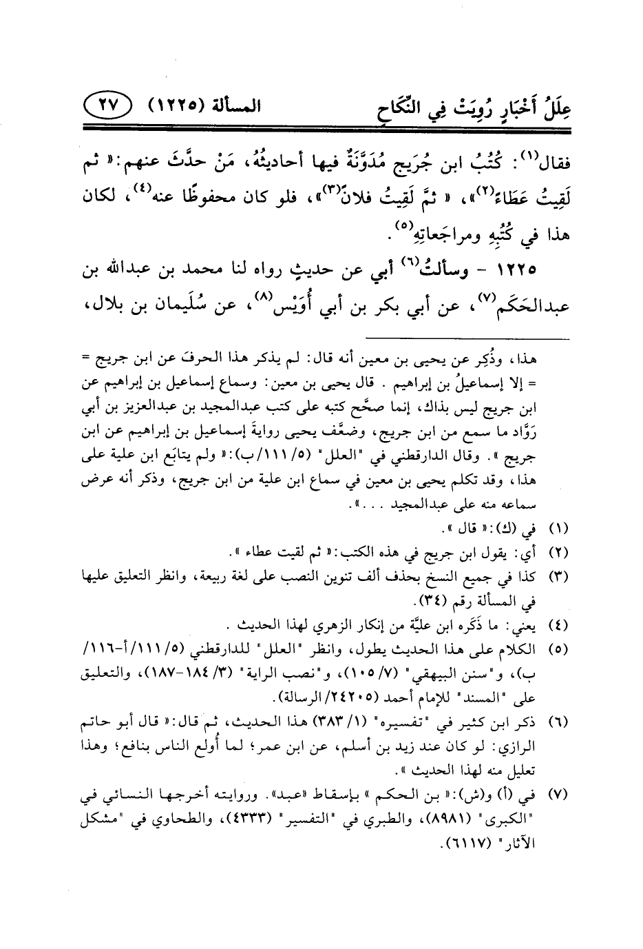 ١٢٢٥ - وسألتُ (٦) أَبِي عَنْ حديثٍ رَوَاهُ لَنَا محمد بن عبد الله بن عبد الحَكَم (٧) ، عَنْ أَبِي بَكْرِ بْنِ أَبِي أُوَيْس (٨) ، عَنْ سُلَيمان بْنِ بِلالٍ،
