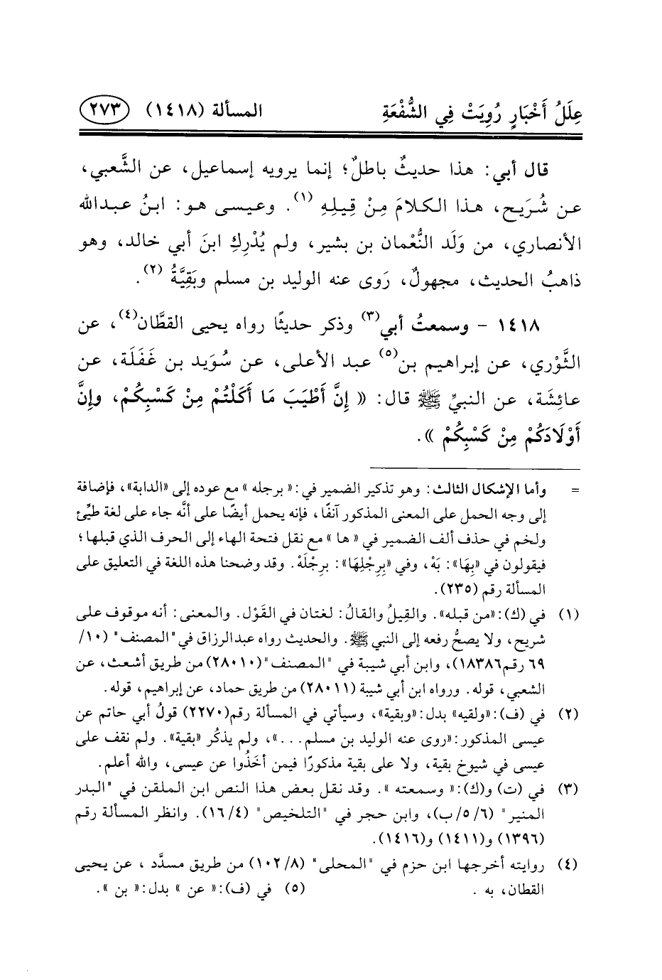١٤١٨ - وسمعتُ أَبِي (٣) وَذَكَرَ حَدِيثًا رَوَاهُ يَحْيَى القطَّان (٤) ، عَنِ الثَّوْري، عن إبراهيم ابن (٥) عَبْدِ الأَعْلَى، عَنْ سُوَيد بْنِ غَفَلَة، عَنْ عائِشَة، عَنِ النبيِّ (ص) قَالَ: إِنَّ أَطْيَبَ مَا أَكَلْتُمْ مِنْ كَسْبِكُمْ، وإِنَّ أَوْلَادَكُمْ مِنْ كَسْبِكُمْ.