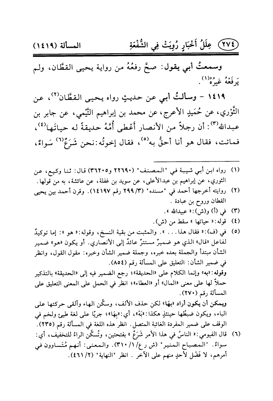 ١٤١٩ - وسألتُ أَبِي عَنْ حديثٍ رَوَاهُ يَحْيَى القطَّان (٢) ، عَنِ الثَّوْري، عَنْ حُمَيدٍ الأَعْرَجِ، عَنْ مُحَمَّدِ بْنِ إِبْرَاهِيمَ التَّيْمي، عَنْ جابر بن عبد الله (٣) : أَنَّ رَجُلا مِنَ الأَنْصَارِ أَعْطى أُمَّهُ حَدِيقَةً لَهُ حياتَها (٤) ، فَمَاتَتْ، فَقَالَ هُوَ أَنَا أحقُّ بِهِ (٥) ، فَقَالَ إخوتُه: نَحْنُ شَرَعٌ (٦) سَواءٌ،