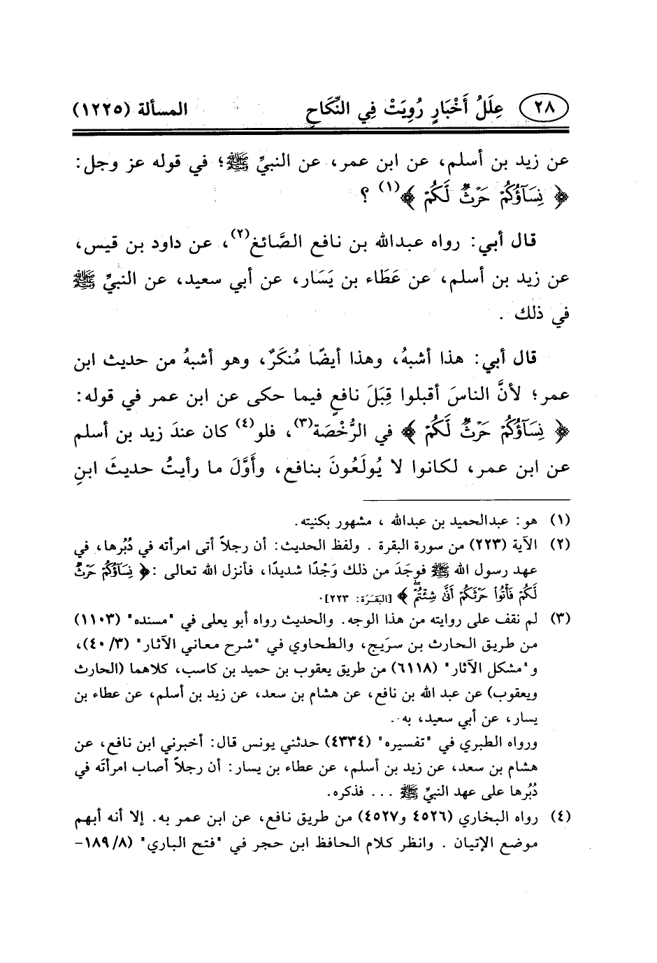 قَالَ أَبِي: هَذَا أشبهُ، وَهَذَا أَيْضًا مُنكَرٌ، وَهُوَ أشبهُ مِنْ حَدِيثِ ابْنِ عُمَرَ؛ لأنَّ الناسَ أَقْبَلُوا قِبَلَ نافعٍ فِيمَا حَكَى عَنِ ابْنِ عُمَرَ في قوله: {نِسَاؤُكُمْ ... } فِي الرُّخْصَة (٣) ، فَلَوْ (٤) كَانَ عندَ زَيْدِ بْنِ أَسْلَمَ عَنِ ابْنِ عُمَرَ، لَكَانُوا لا يُولَعُونَ بِنَافِعٍ، وأَوَّلَ مَا رأيتُ حديثَ ابنِ