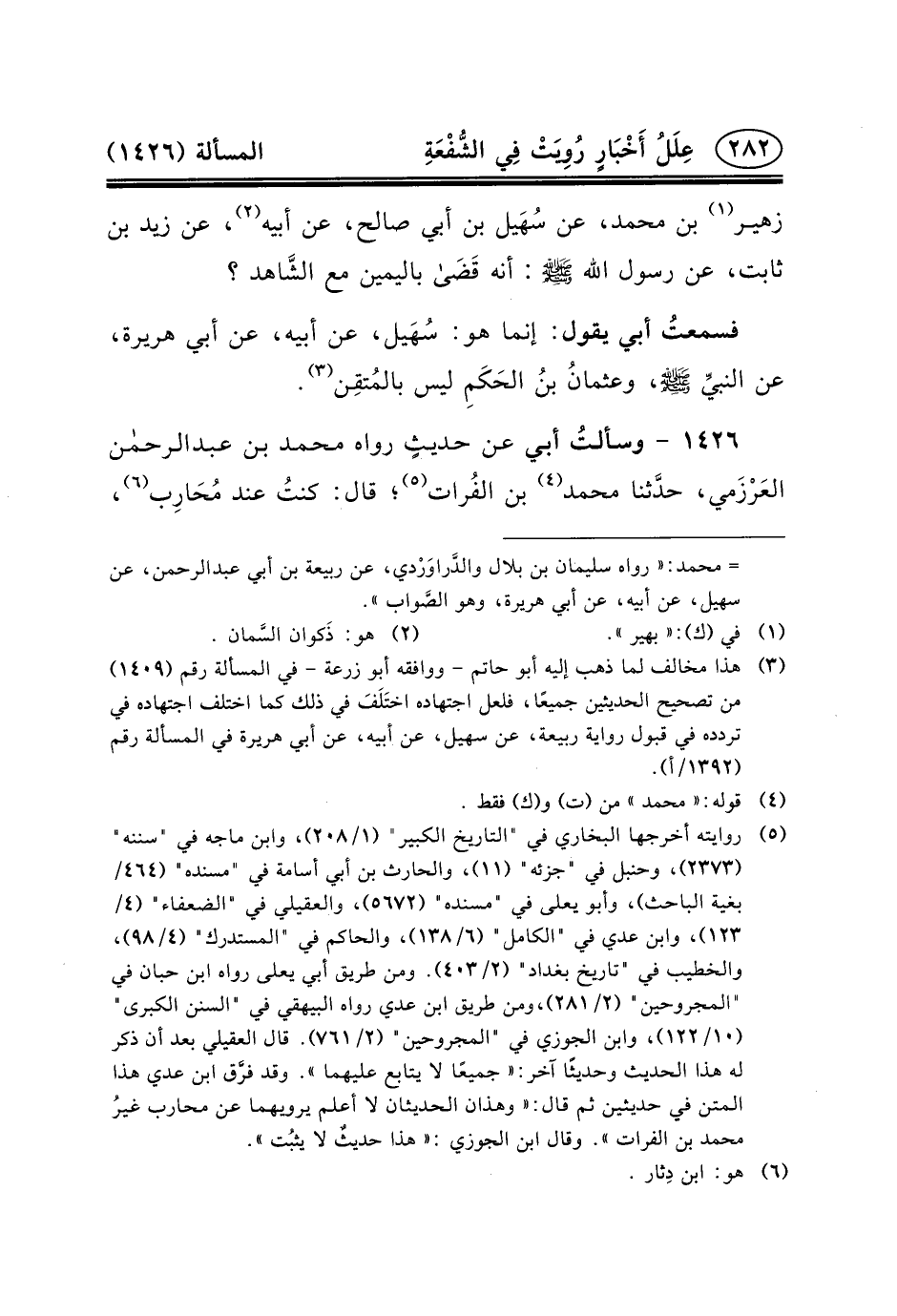 ١٤٢٦- وسألتُ أَبِي عن حديثٍ رواه محمد ابن عبد الرحمن العَرْزَمي، حدَّثنا مُحَمَّدُ (٤) بْنُ الفُرات (٥) ؛ قال: كنتُ عند مُحَارِب (٦) ،