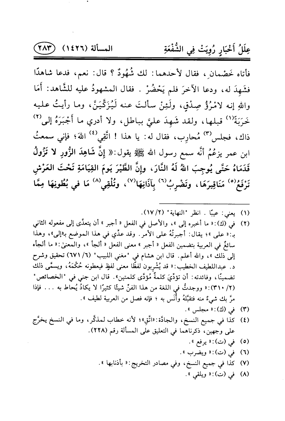 ذَاكَ، فَجَلَسَ (٣) مُحارِب، فَقَالَ لَهُ: يَا هَذَا! اتَّقِي (٤) اللهَ؛ فَإِنِّي سمعتُ ابْنَ عُمَرَ يزعُمُ أنَّه سَمِعَ رَسُولَ اللَّهِ (ص) يَقُولُ: إِنَّ شَاهِدَ الزُّورِ لا تَزُولُ قَدَمَاهُ حَتَّى يُوجِبَ اللهُ لَهُ النَّارَ، وإِنَّ الطَّيْرَ يَومَ القِيَامَةِ تَحْتَ العَرْشِ تَرْفَعُ (٥) مَنَاقِيرَهَا، وتَضْرِبُ (٦) بِآذَانِهَا (٧) ، وتُلْقِي (٨) مَا فِي بُطُونِهَا مِمَّا
