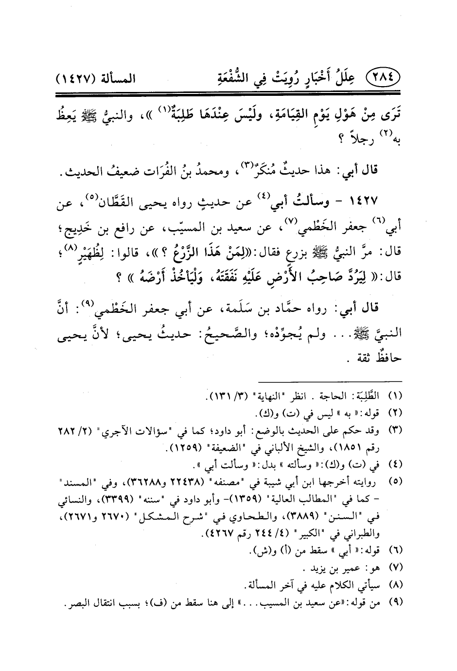١٤٢٧ - وسألتُ أَبِي (٤) عَنْ حديثٍ رَوَاهُ يَحْيَى القَطَّان (٥) ، عَنْ أَبِي (٦) جَعْفَر الخَطْمي (٧) ، عَنْ سَعِيدِ بْنِ الْمُسَيِّبِ، عَنْ رَافِعِ ابن خَدِيج؛ قال: مرَّ النبيُّ (ص) بزرعٍ فَقَالَ: لِمَنْ هَذَا الزَّرْعُ؟ ، قَالُوا: لِظُهَيْرٍ (٨) ؛ قَالَ: لِيَرُدَّ صَاحِبُ الأَرْضِ عَلَيْهِ نَفَقَتَهُ، وَلْيَأخُذْ أَرْضَهُ؟