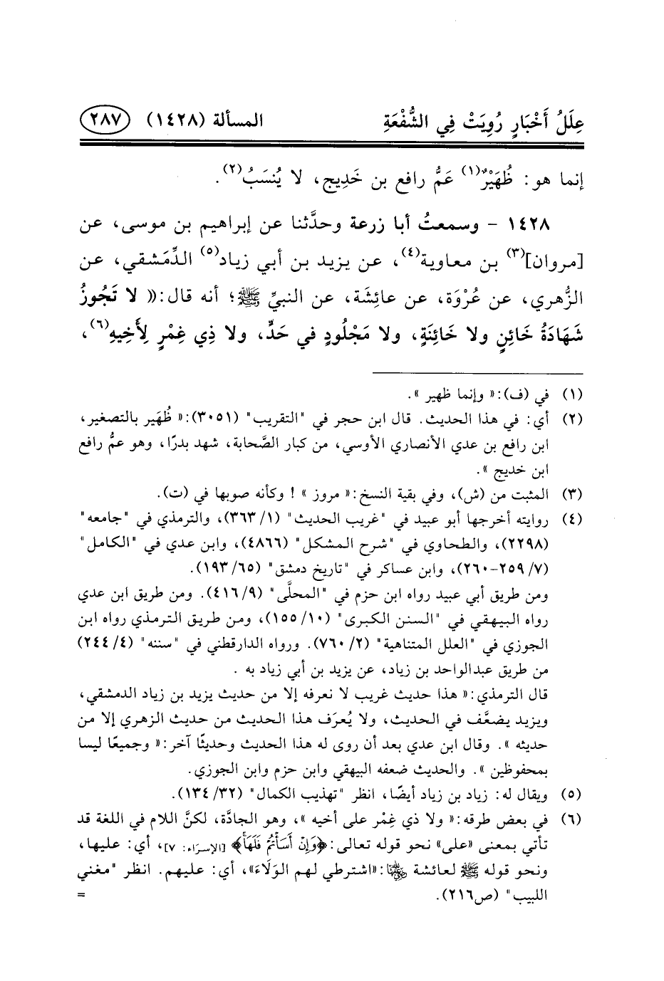 ١٤٢٨ - وسمعتُ أَبَا زُرْعَةَ وحدَّثنا عَنْ إِبْرَاهِيمَ بْنِ مُوسَى، عَنْ [مَرْوَانَ] (٣) بْنِ مُعَاوِيَةَ (٤) ، عَنْ يَزِيدَ بْنِ أَبِي زِيَادٍ (٥) الدِّمَشقي، عَنِ الزُّهري، عَنْ عُرْوَة، عَنْ عائِشَة، عَنِ النبيِّ (ص) ؛ أَنَّهُ قَالَ: لا تَجُوزُ شَهَادَةُ خَائِنٍ وَلا خَائِنَةٍ، وَلا مَجْلُودٍ فِي حَدٍّ، وَلا ذِي غِمْرٍ لأَِخِيهِ (٦) ،