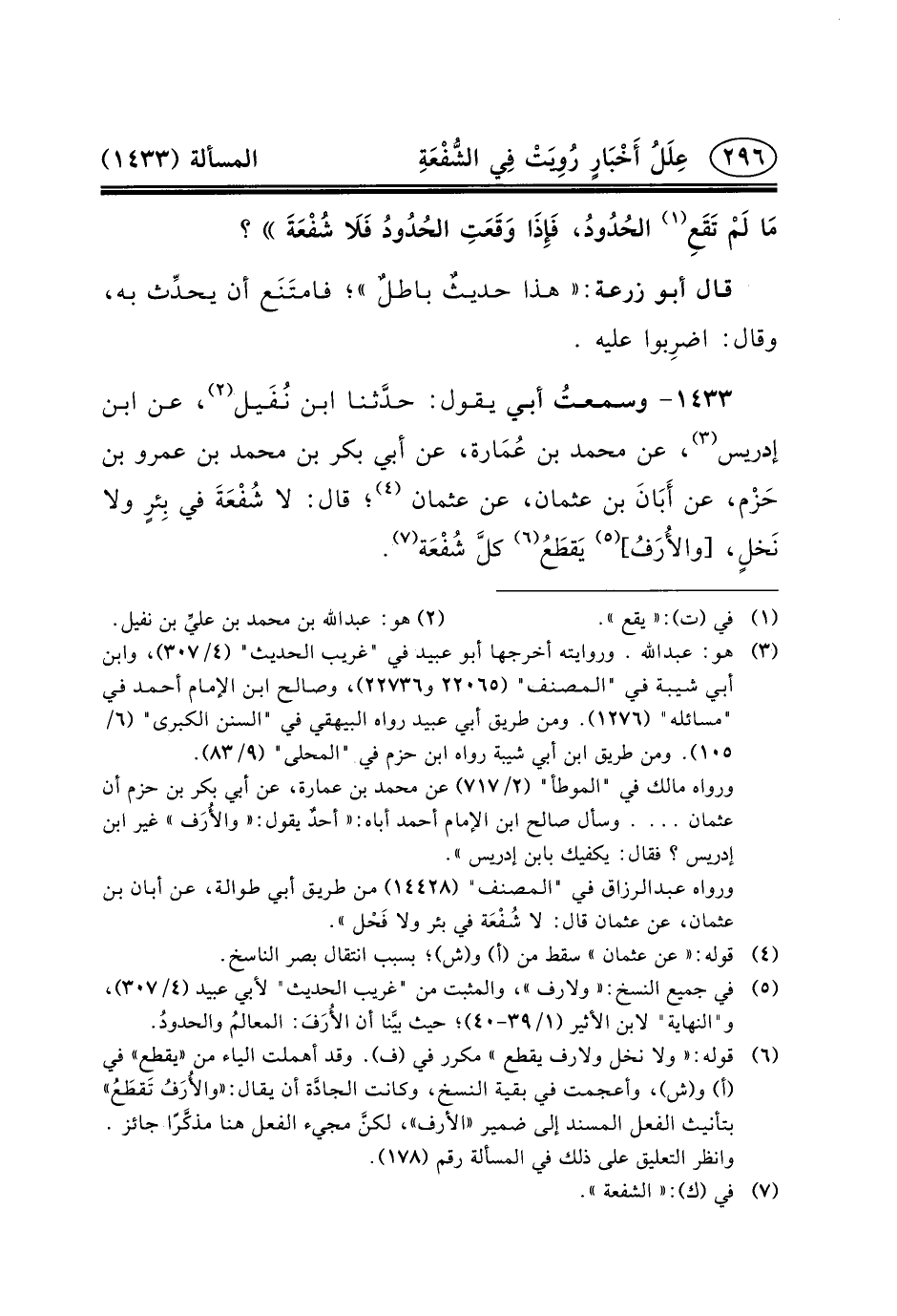 ورواه مالك في "الموطأ" (٢/٧١٧) عَنْ مُحَمَّدِ بْنِ عُمَارَةَ، عَنْ أبي بكر بن حزم أن عثمان ... . وسأل صالح ابن الإمام أحمد أباه: «أحدٌ يقول: «والأُرَف» غير ابن إدريس؟ فقال: يكفيك بابن إدريس» .