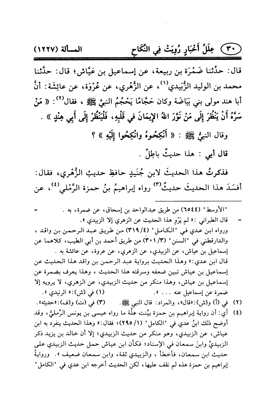 (٤) أي: أن رواية إبراهيم بن حمزة بيَّنت علَّة ما رواه عيسى ابن يونس الرَّمليُّ، وقد أوضح ذلك ابنُ عدي في "الكامل" (١/٢٩٥) ؛ فقال: «وهذا الحديث ينفرد به ابن عياش، عن الزبيدي، وهو منكر من حديث الزبيدي؛ إلا أن خالد بن يزيد ذكر الزبيديَّ وابنَ سمعان في الإسناد؛ فكأن ابن عياش حمل حديث الزبيدي على حديث ابن سمعان، فأخطأ، والزبيدي ثقة، وابن سمعان ضعيف» . وروايةُ إبراهيم بن حمزة هذه لم نقف عليها، لكن الحديث أخرجه ابن عدي في "الكامل" (١/٢٩٥) من طريق خالد بن يزيد الرملي، والدارقطني في "السنن" (٣/٣٠٠) من طريق عيسى بن محمد النحاس، كلاهما عن ضمرة، عَنْ إِسْمَاعِيلَ بْنِ عَيَّاشٍ، عَنْ الزُّبَيْدِيِّ وَابْنِ سَمْعَانَ، عَنِ الزُّهْرِيِّ، عن عروة، عن عائشة، به.