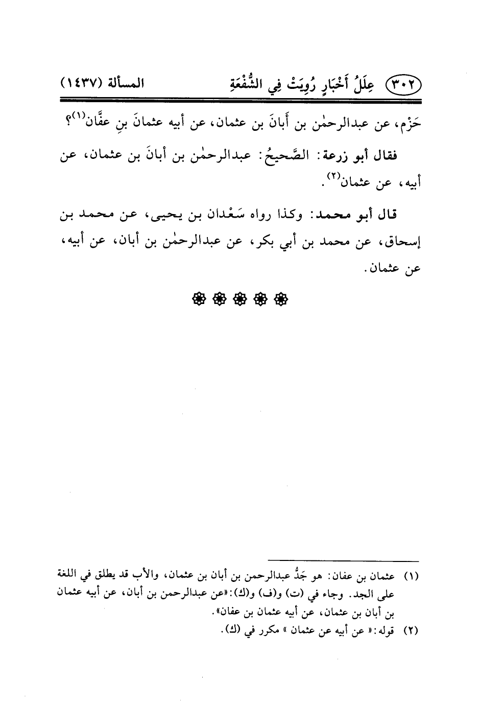 (٥) عثمان بن عفان: هو جَدُّ عبد الرحمن بن أبان بن عثمان، والأب قد يطلق في اللغة على الجد. وجاء في (ت) و (ف) و (ك) : «عن عبد الرحمن بْنِ أَبَانٍ، عَنْ أَبِيهِ عُثْمَانَ بْنِ أَبَانِ بْنِ عُثْمَانَ، عَنْ أبيه عثمان بن عفان» .