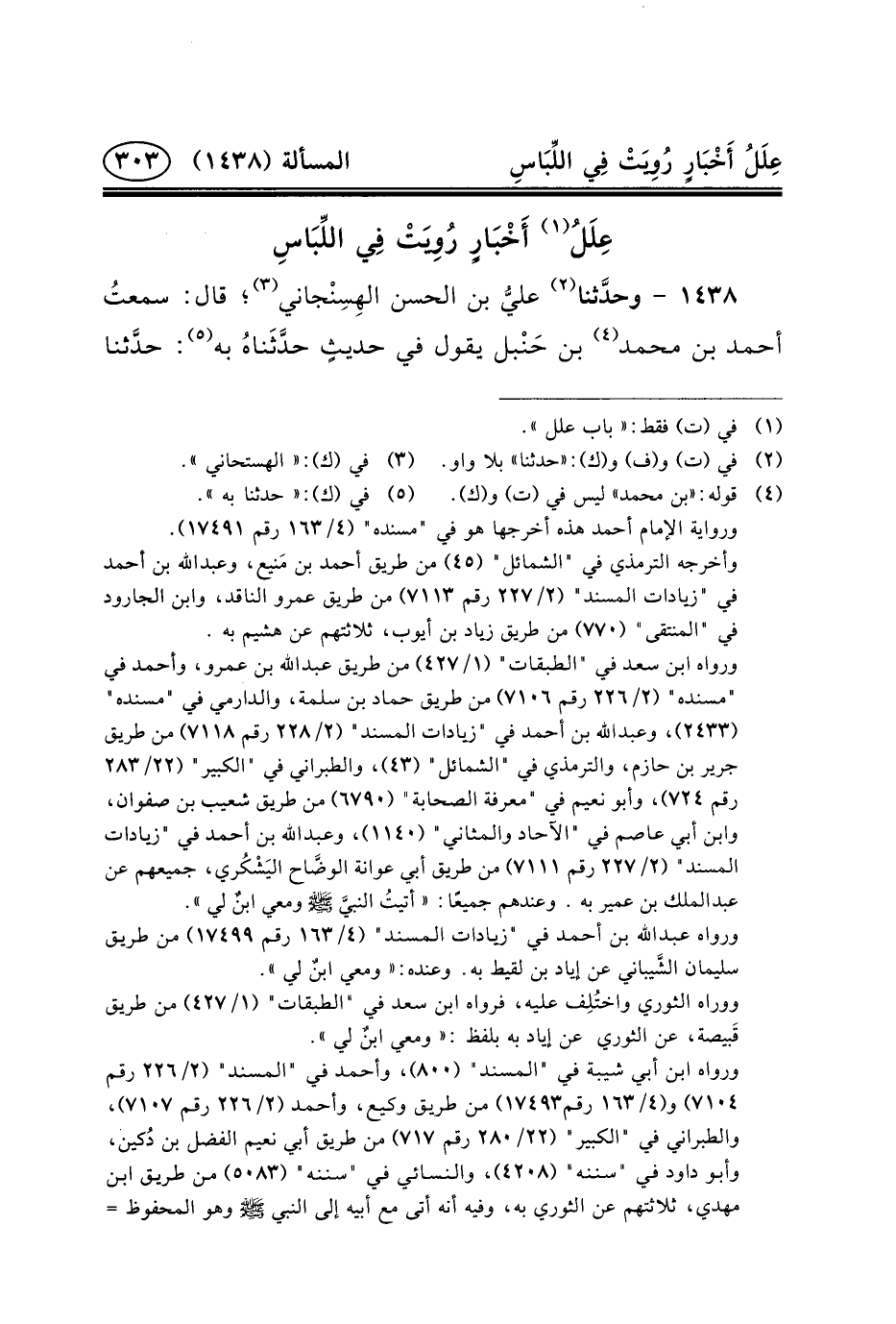 ١٤٣٨ - وحدَّثنا (٢) عليُّ بْنُ الْحَسَنِ الهِسِنْجاني (٣) ؛ قَالَ: سمعتُ أَحْمَدَ بْنَ مُحَمَّدٍ (٤) بْنِ حَنْبل يَقُولُ فِي حديثٍ حدَّثَناهُ به (٥) :
