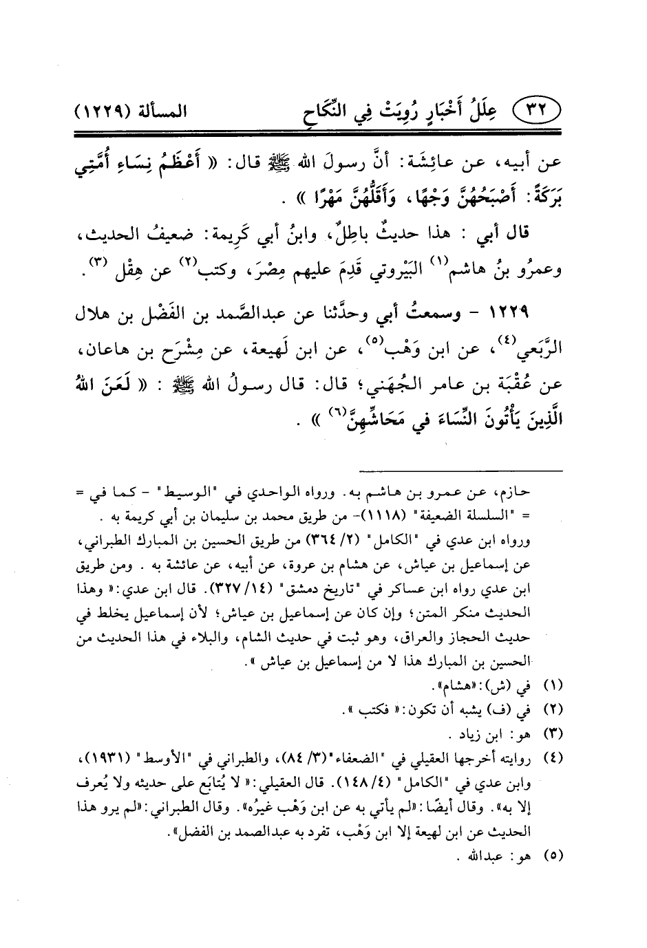 ١٢٢٩ - وسمعتُ أبي وحدَّثنا عن عبد الصَّمد بْنِ الفَضْل بْنِ هِلالٍ الرَّبَعي (٤) ، عَنِ ابْنِ وَهْب (٥) ، عَنِ ابْنِ لَهيعة، عَنْ مِشْرَح بْنِ هَاعَانَ، عَنْ عُقْبَة بْنِ عَامِرٍ الجُهَني؛ قال: قال رسولُ الله (ص) : لَعَنَ اللهُ الَّذِينَ يَأْتُونَ النِّسَاءَ في مَحَاشِّهِنَّ (٦) .