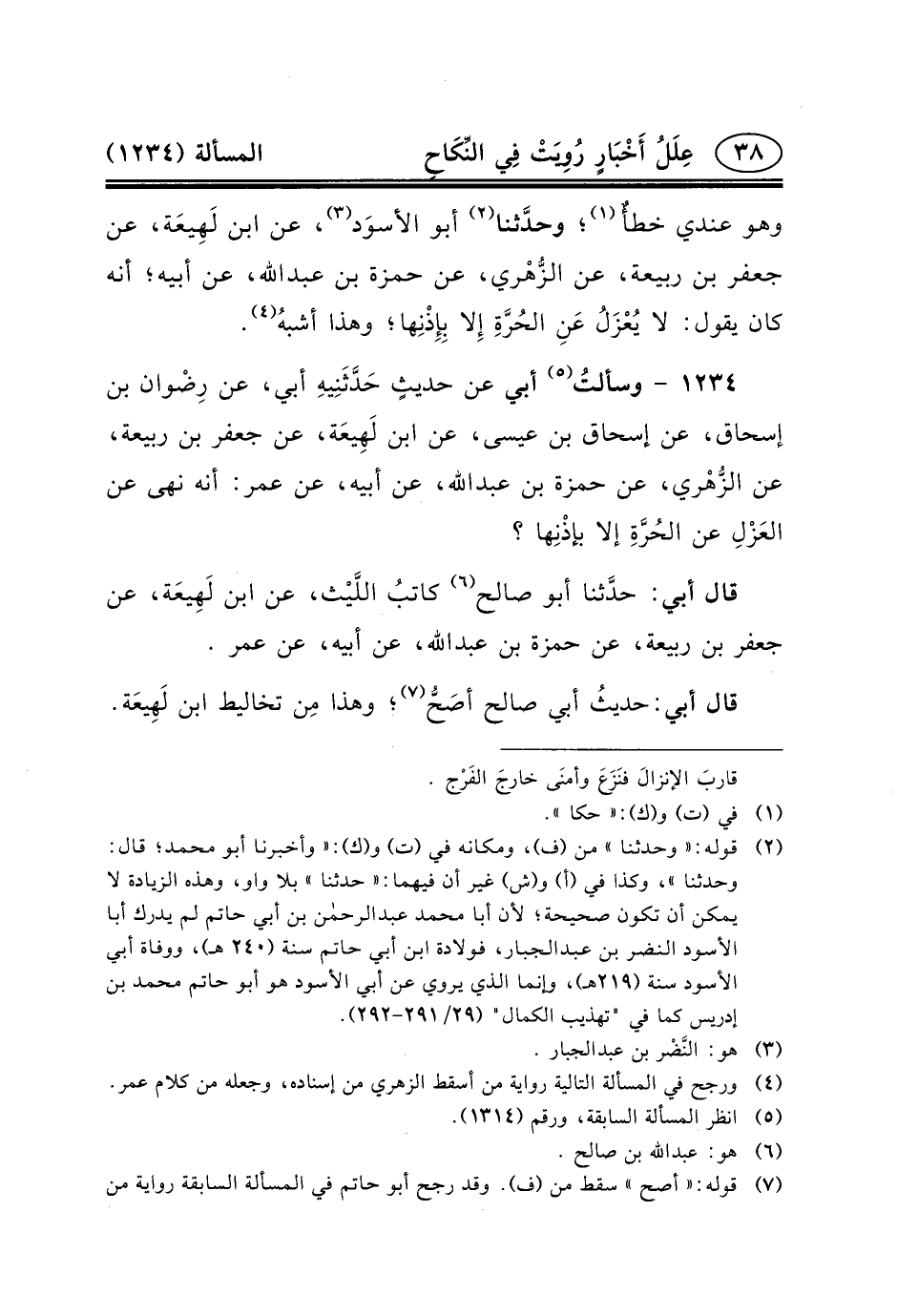 ١٢٣٤ - وسألتُ (٥) أَبِي عَنْ حديثٍ حَدَّثَنِيهِ أَبِي، عَنْ رِضْوان بْنِ إِسْحَاقَ، عَنْ إِسْحَاقَ بْنِ عِيسَى، عَنِ ابْنِ لَهِيعَة، عَنْ جَعْفَرِ بْنِ رَبِيعَةَ، عَنْ الزُّهْري، عن حمزة بن عبد الله، عَنْ أَبِيهِ، عَنْ عُمَرَ: أَنَّهُ نَهَى عَنِ العَزْلِ عَنِ الحُرَّةِ إِلا بإذْنِها؟
