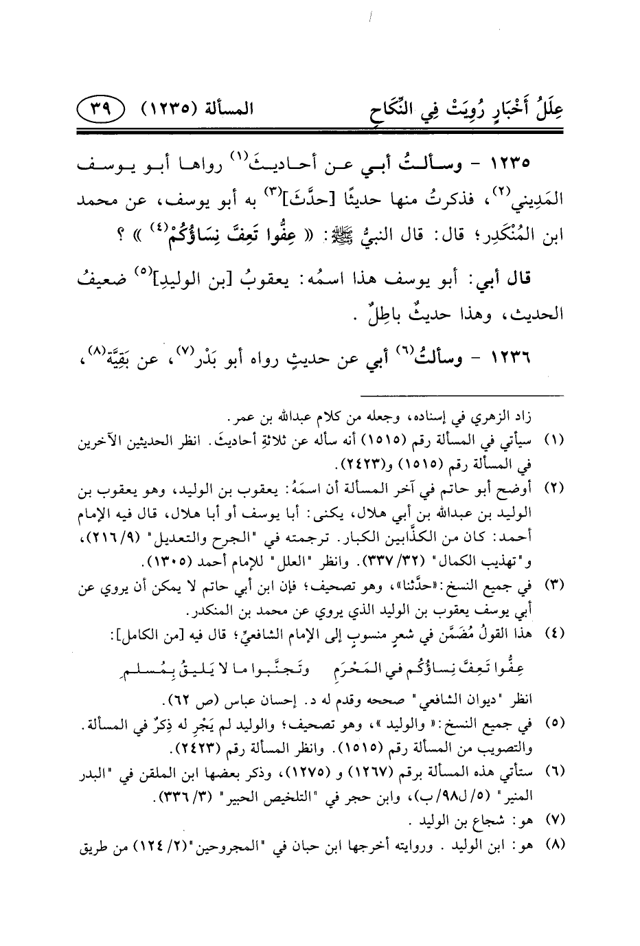 ١٢٣٥ - وسألتُ أَبِي عَنْ أحاديثَ (١) رَوَاهَا أَبُو يُوسُفَ المَدِيني (٢) ، فذكرتُ مِنْهَا حديثًا [حدَّثَ] (٣) بِهِ أَبُو يُوسُفَ، عَنْ مُحَمَّدِ ابن المُنْكَدِر؛ قال: قال النبيُّ (ص) : عِفُّوا تَعِفَّ نِسَاؤُكُمْ (٤) ؟