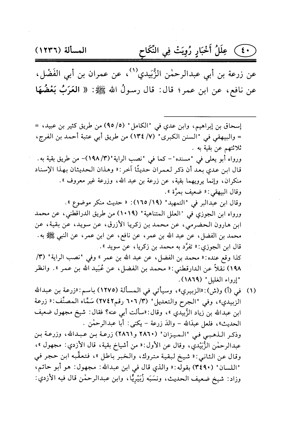 (١) في (أ) و (ش) : «الزبيري» ، وسيأتي في المسألة (١٢٧٥) باسم: «زرعة بن عبد الله الزبيدي» ، وفي "الجرح والتعديل" (٣/٦٠٦ رقم٢٧٤٢) سَمَّاه المصنِّف: «زرعة ابن عبد الله بن زياد الزُّبيدي» ، وقال: «سألت أبي عنه؟ فقال: شيخ مجهول ضعيف الحديث» ، فلعل عبدَالله - والدَ زرعة - يكنى: أبا عبد الرحمن.