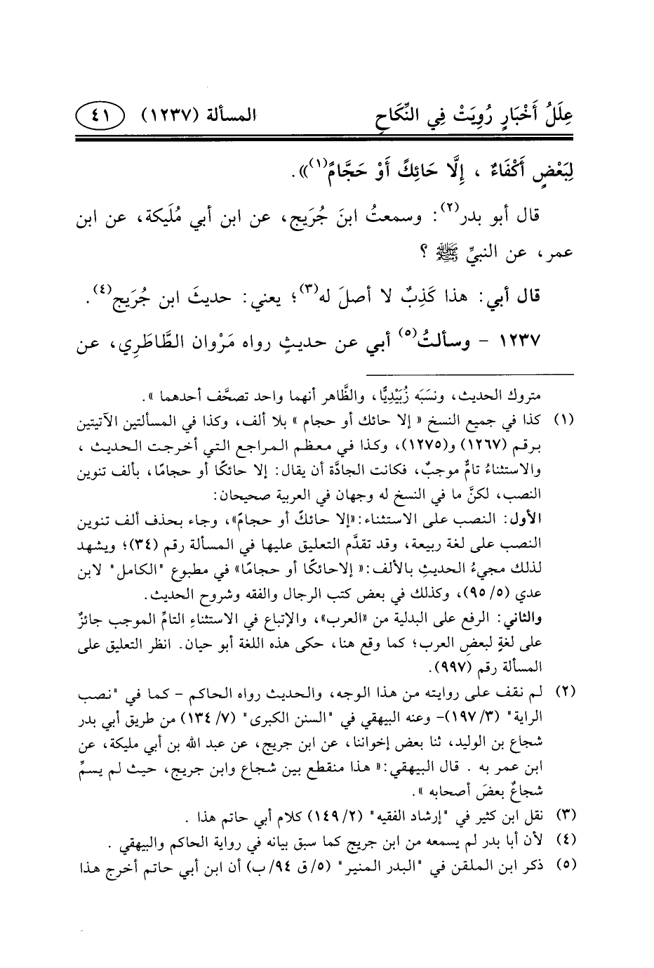 (٥) ذكر ابن الملقن في "البدر المنير" (٥/ق ٩٤/ب) أن ابن أبي حاتم أخرج هذا الحديث في "العلل" بسند جيد، وانظر "التلخيص الحبير" (٣/٣٥٠) ، وانظر المسألة رقم (١٢٣٢) .