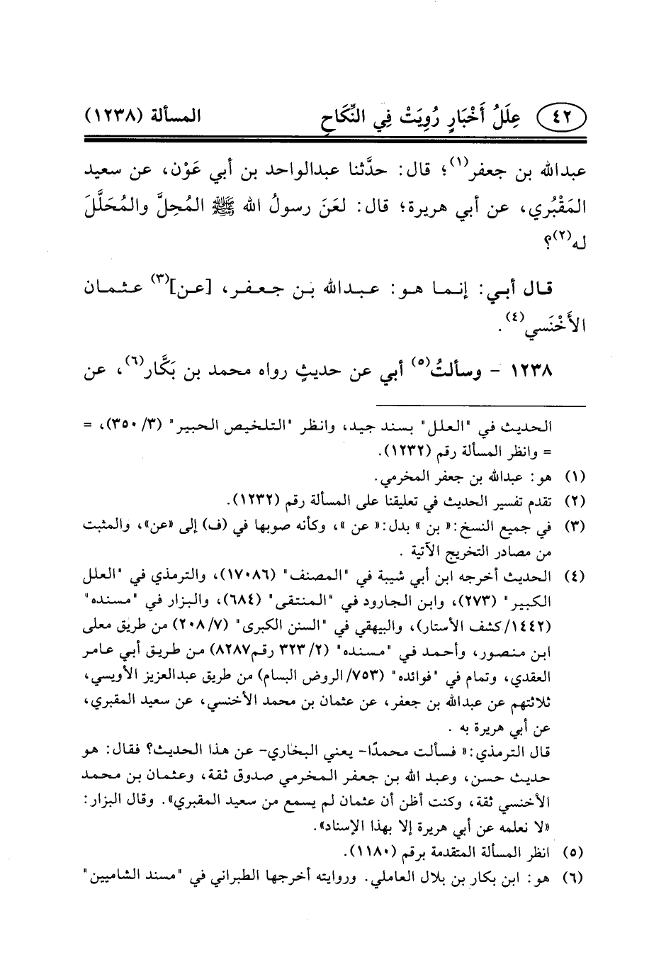 (٤) الحديث أخرجه ابن أبي شيبة في "المصنف" (١٧٠٨٦) ، والترمذي في "العلل الكبير" (٢٧٣) ، وابن الجارود في "المنتقى" (٦٨٤) ، والبزار في "مسنده" (١٤٤٢/كشف الأستار) ، والبيهقي في "السنن الكبرى" (٧/٢٠٨) من طريق معلى ابن منصور، وأحمد في "مسنده" (٢/٣٢٣ رقم٨٢٨٧) من طريق أبي عامر العقدي، وتمام في "فوائده" (٧٥٣/الروض البسام) من طريق عبد العزيز الأويسي، ثلاثتهم عن عبد الله بْنِ جَعْفَرٍ، عَنْ عُثْمَانَ بْنِ محمد الأخنسي، عَنْ سَعِيدٍ الْمَقْبُرِيِّ، عَنْ أَبِي هريرة به.
