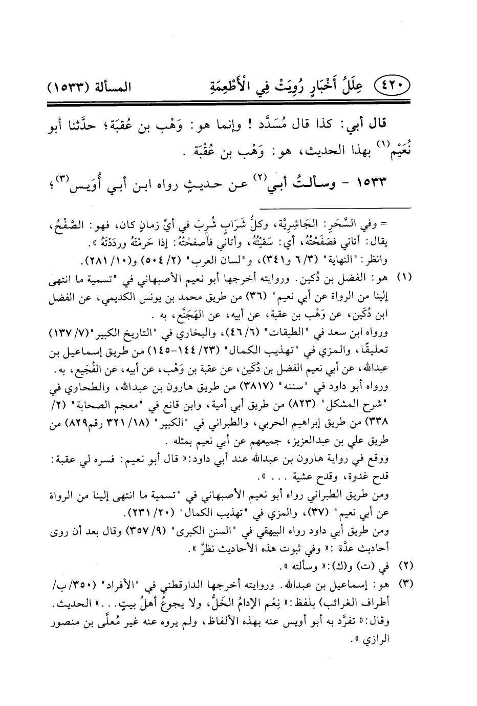 ١٥٣٣ - وسألتُ أَبِي (٢) عَن حديثٍ رَوَاهُ ابْنُ أبي أُوَيس (٣) ؛