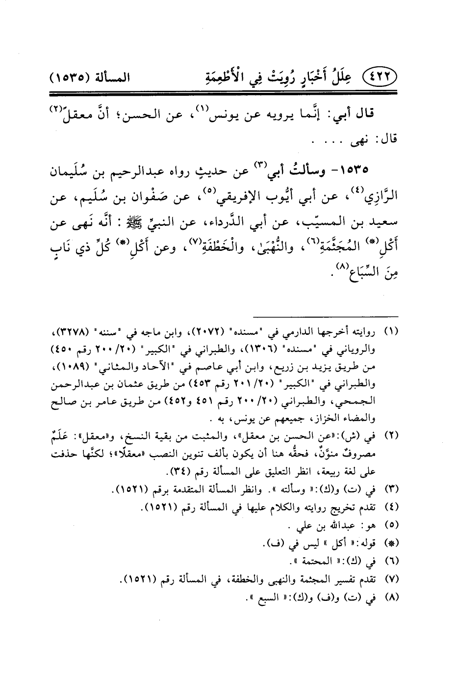 ١٥٣٥- وسألتُ أَبِي (٣) عَنْ حديثٍ رواه عبد الرحيم بْنِ سُلَيمان الرَّازِي (٤) ، عَنْ أَبِي أيُّوب الأَفْرِيقِيِّ (٥) ، عَنْ صَفْوان بْنِ سُلَيم، عَنْ سَعِيدِ بْنِ الْمُسَيِّبِ، عَنْ أَبِي الدَّرداء، عَنِ النبيِّ (ص) : أنَّه نَهى عَنْ أَكْلِ (*) المُجَثَّمَةِ (٦) ، والنُّهْبَى، والْخَطْفَةِ (٧) ، وَعَنْ أَكْلِ (*) كُلِّ ذي نَابٍ مِنَ السِّبَاع (٨) .