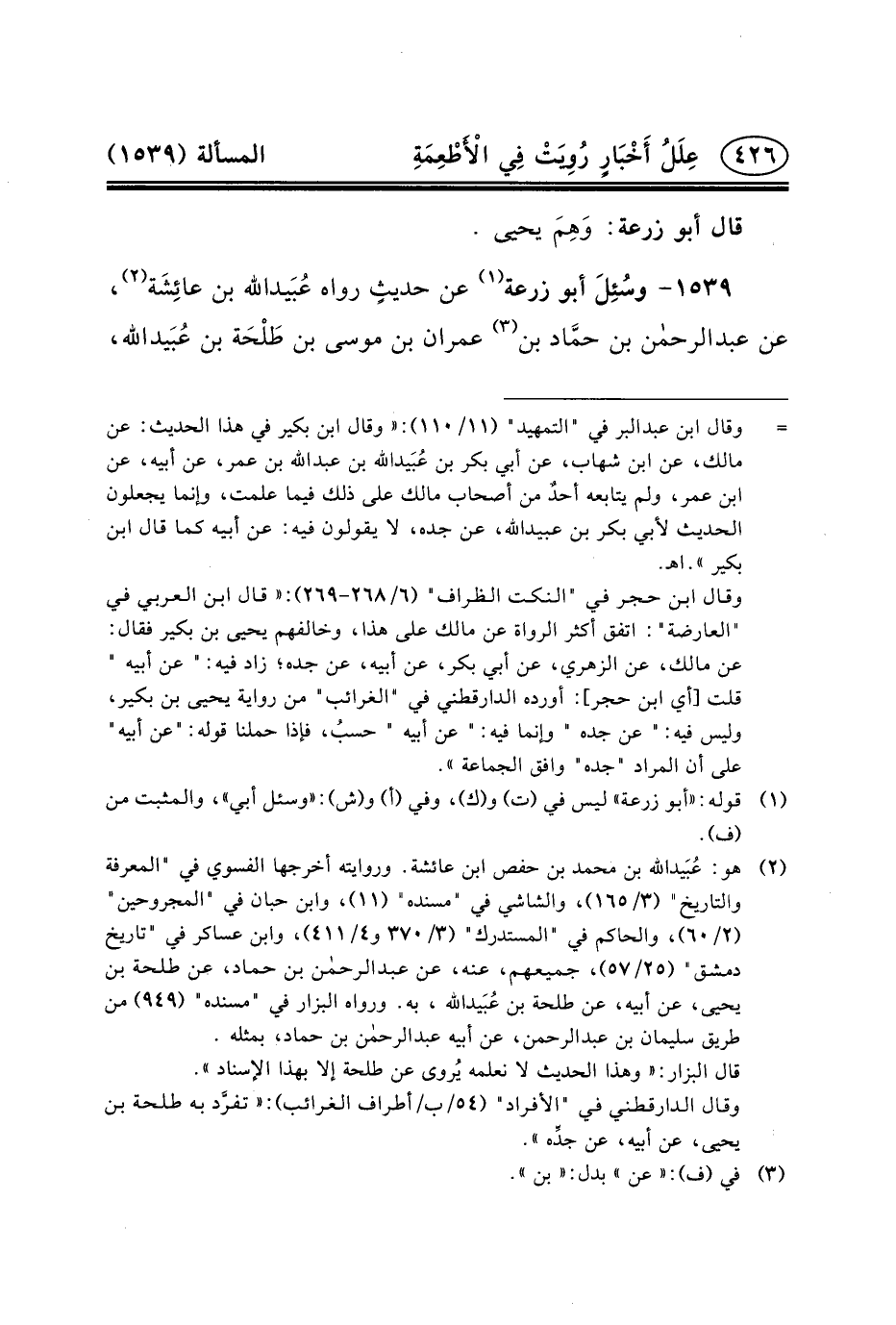 ١٥٣٩- وسُئِلَ أَبُو زُرْعَةَ (١) عَنْ حديثٍ رواه عُبَيدالله بن عائِشَة (٢) ،