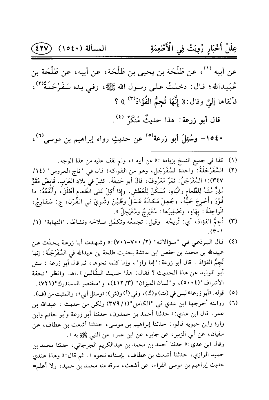 (٤) قال البرذعي في "سؤالاته" (٢/٧٠٠-٧٠١) : «وشهدت أبا زرعة يحدِّث عن عبيد الله بن محمد بن حفص ابن عائشة بحديث طلحة بن عبيد الله في السَّفَرْجَلَة: إِنَّهَا تُجِمُّ الفؤادَ. قَالَ أَبُو زرعة: "إما واهٍ"، وإما كلمة نحوها، ثم قال أبو زرعة: سئل = = أبو الوليد عَن هَذَا الْحَدِيثِ؟ فَقَالَ: هَذَا حديث البقَّالين» . اهـ. وانظر "تحفة الأشراف" (٥٠٠٤) ، و"لسان الميزان" (٣/٤١٢) ، و"مختصر المستدرك" (٧٢١) .