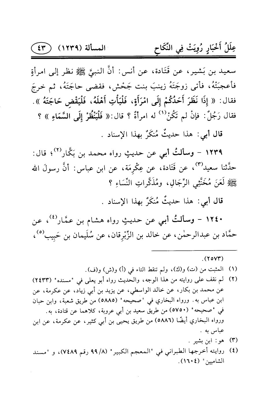 ١٢٣٩ - وسألتُ أَبِي عَنْ حديثٍ رَوَاهُ مُحَمَّدُ بْنُ بَكَّار (٢) ؛ قَالَ: حدَّثنا سَعِيدٌ (٣) ، عَنْ قَتَادة، عَنْ عِكْرِمَة، عَنِ ابْنِ عباس: أنَّ رسولَ الله (ص) لَعَنَ مُخَنَّثِي الرِّجَالِ، ومُذَكَّراتِ النِّسَاءِ؟