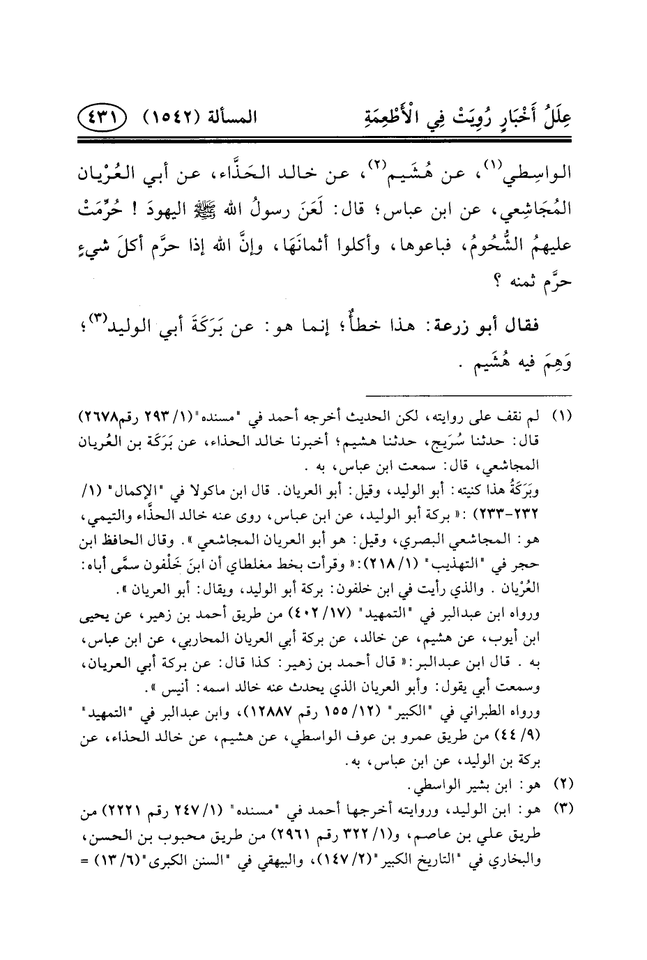 عَنْ هُشَيم (٢) ، عَنْ خَالِدٍ الحَذَّاء، عَنْ أَبِي العُرْيان المُجَاشِعي، عَنِ ابْنِ عَبَّاسٍ؛ قَالَ: لَعَنَ رسولُ الله (ص) اليهودَ! حُرِّمَتْ عليهمُ الشُّحُومُ، فَبَاعُوهَا، وأكلوا أثمانَهَا، وإنَّ اللَّهُ إِذَا حرَّم أكلَ شيءٍ حرَّم ثَمَنَهُ؟