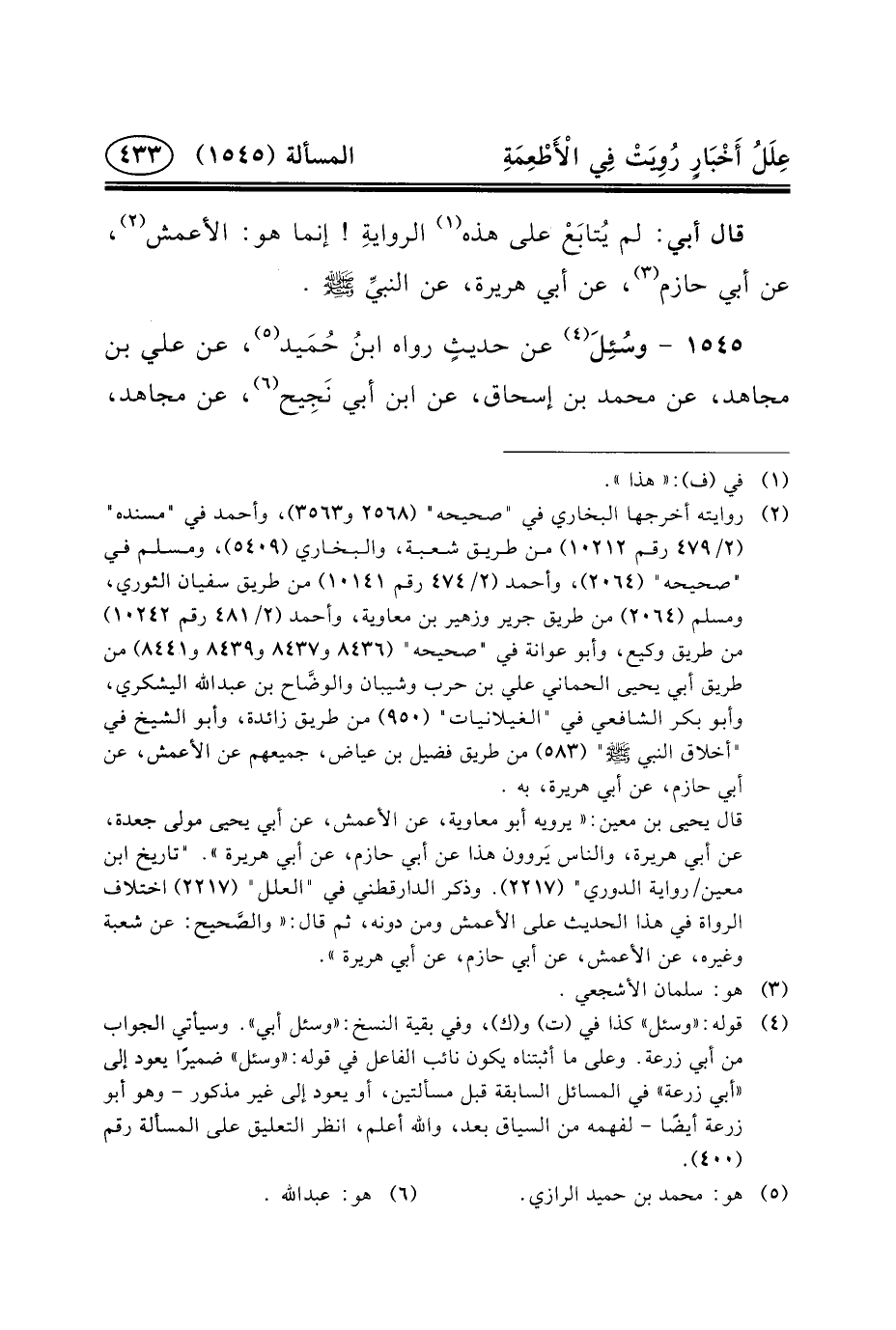 (٤) قوله: «وسئل» كذا في (ت) و (ك) ، وفي بقية النسخ: «وسئل أبي» . وسيأتي الجواب من أبي زرعة. وعلى ما أثبتناه يكون نائب الفاعل في قوله: «وسئل» ضميرًا يعود إلى «أبي زرعة» في المسائل السابقة قبل مسألتين، أو يعود إلى غير مذكور - وهو أبو زرعة أيضًا - لفهمه من السياق بعد، والله أعلم، انظر التعليق على المسألة رقم (٤٠٠) .