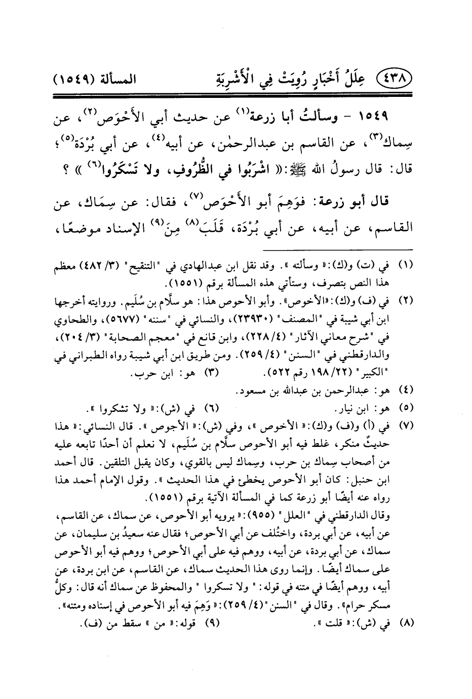 ١٥٤٩ - وسألتُ أَبَا زُرْعَةَ (١) عَنْ حَدِيثٍ أَبِي الأَحْوَص (٢) ، عَنْ سِماك (٣) ، عَنْ القاسم بن عبد الرحمن، عَنْ أَبِيهِ (٤) ، عَنْ أَبِي بُرْدَة (٥) ؛ قال: قال رسولُُ الله (ص) : اشْرَبُوا فِي الظُّرُوفِ، وَلا تَسْكَرُوا (٦) ؟
