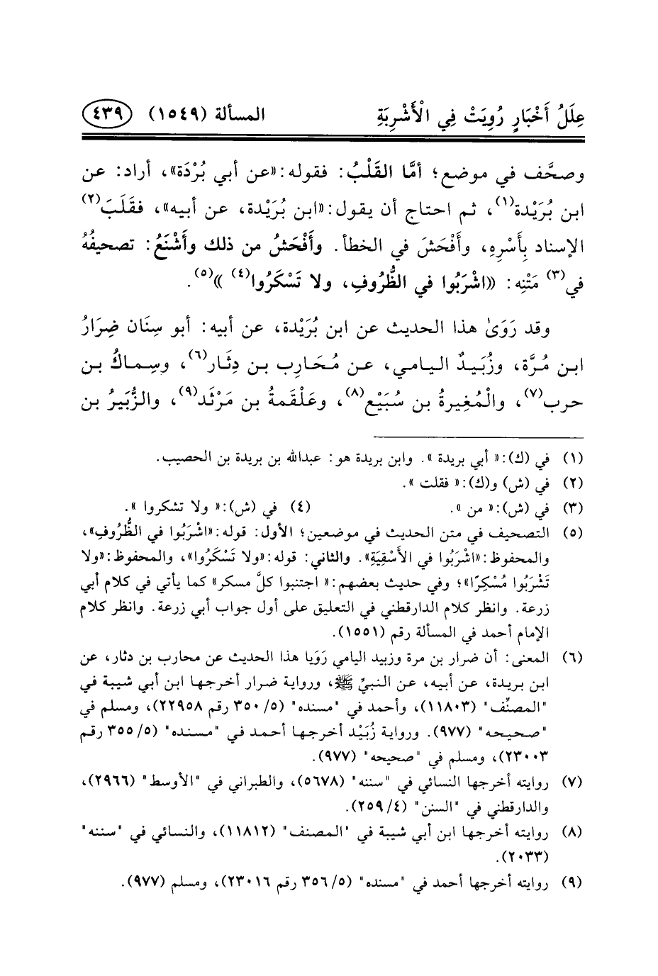 (٥) التصحيف في متن الحديث في موضعين؛ الأول: قوله: «اشْرَبُوا في الظُّرُوفِ» ، والمحفوظ: «اشْرَبُوا في الأَسْقِيَةِ» . والثاني: قوله: «ولا تَسْكَرُوا» ، والمحفوظ: «وَلا تَشْرَبُوا مُسْكِرًا» ؛ وَفِي حَدِيثِ بعضهم: «اجتنبوا كلَّ مسكر» كما يأتي في كلام أبي زرعة. وانظر كلام الدارقطني في التعليق على أول جواب أبي زرعة. وانظر كلام الإمام أحمد في المسألة رقم (١٥٥١) .