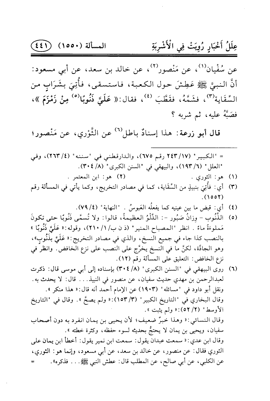 عَنْ سُفْيان (١) ، عَنْ مَنْصور (٢) ، عَن خَالِدِ بْنِ سَعْدٍ، عَنْ أَبِي مسعود: أنَّ النبيَّ (ص) عَطِشَ حَوْلَ الْكَعْبَةِ، فَاسْتَسْقَى، فأُتِيَ بشَرَابٍ مِنَ السِّقَاية (٣) ، فشَمَّهُ، فقَطَّبَ (٤) ، فَقَالَ: عَلَيَّ ذَنُوبًا (٥) مِنْ زَمْزَمَ، فصَبَّهُ عَلَيْهِ، ثُمَّ شَرِبَهُ؟