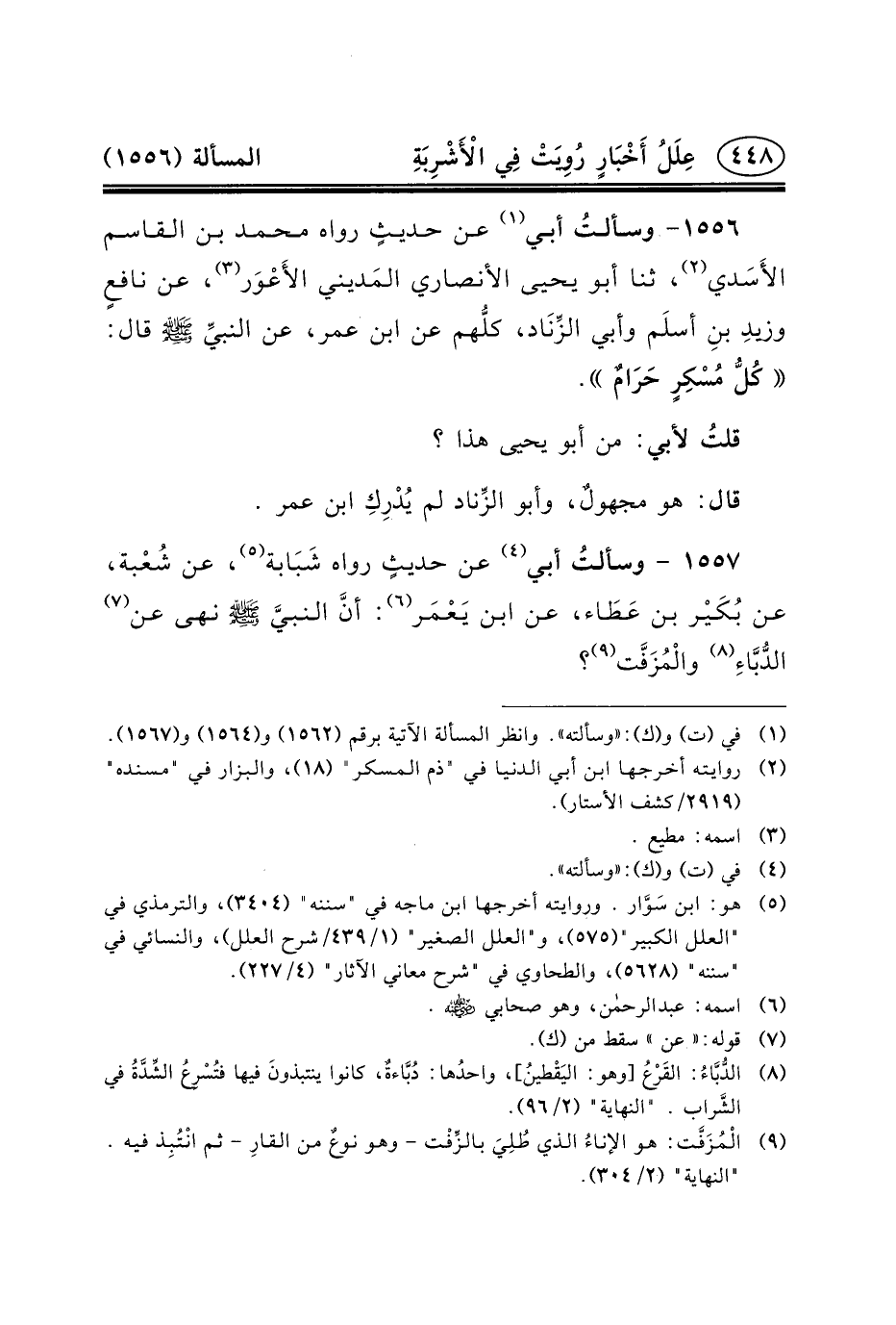 ١٥٥٧ - وسألتُ أَبِي (٤) عَنْ حديثٍ رَوَاهُ شَبَابة (٥) ، عَنْ شُعْبة، عَنْ بُكَيْر بْنِ عَطَاء، عَنِ ابْنِ يَعْمَر (٦) : أنَّ النبيَّ (ص) نهى عن (٧) الدُّبَّاءِ (٨) والْمُزَفَّت (٩) ؟