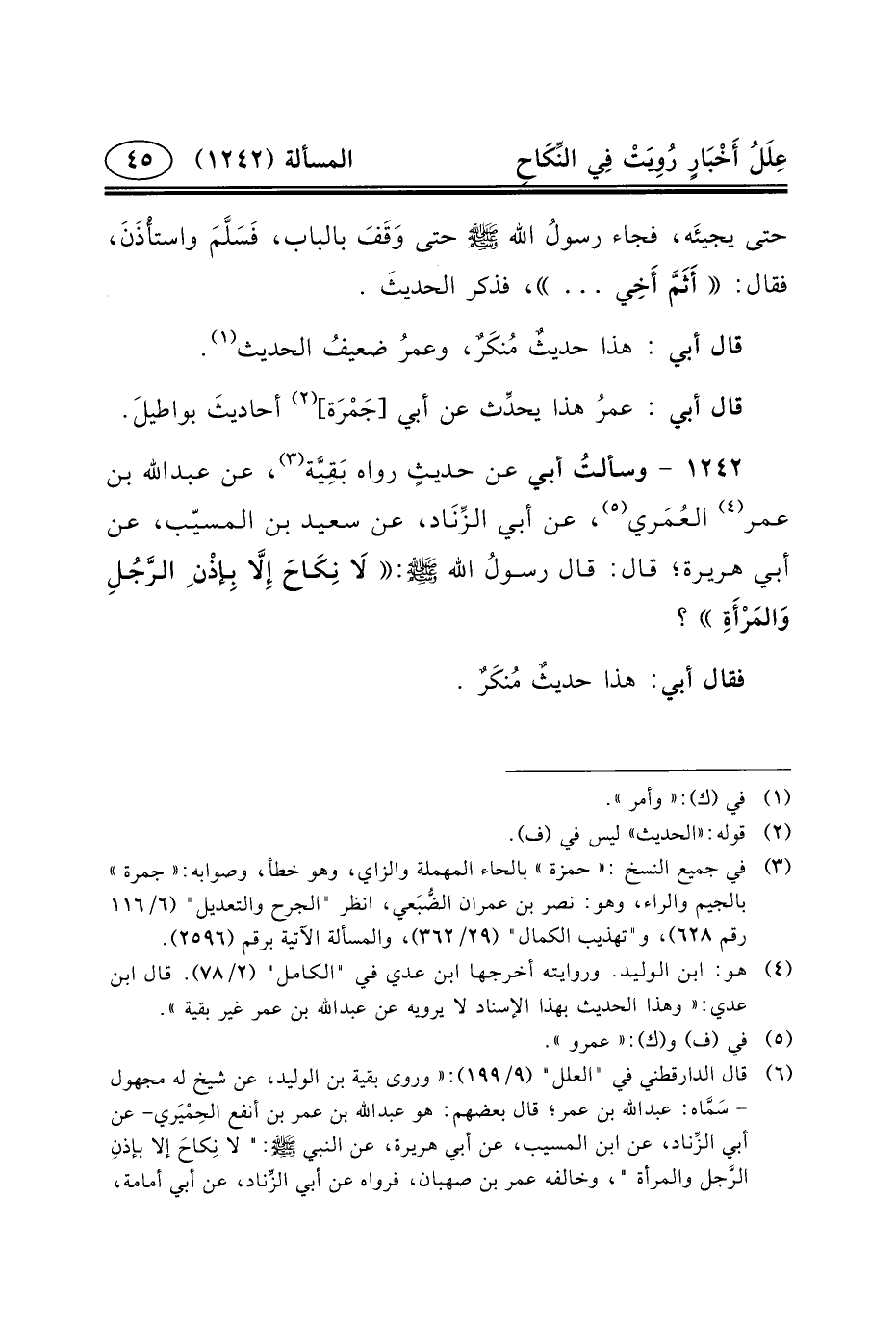 ١٢٤٢ - وسألتُ أَبِي عَنْ حديثٍ رواه بَقِيَّة (٣) ، عن عبد الله بْنِ عُمَرَ (٤) العُمَري (٥) ، عَنْ أَبِي الزِّنَاد، عَنْ سَعِيدِ بْنِ الْمُسَيِّبِ، عَنْ أَبِي هُرَيْرَةَ؛ قَالَ: قَالَ رسولُ الله (ص) : لَا نِكَاحَ إِلَاّ بِإذْن ِ الرَّجُلِ وَالمَرْأَةِ؟