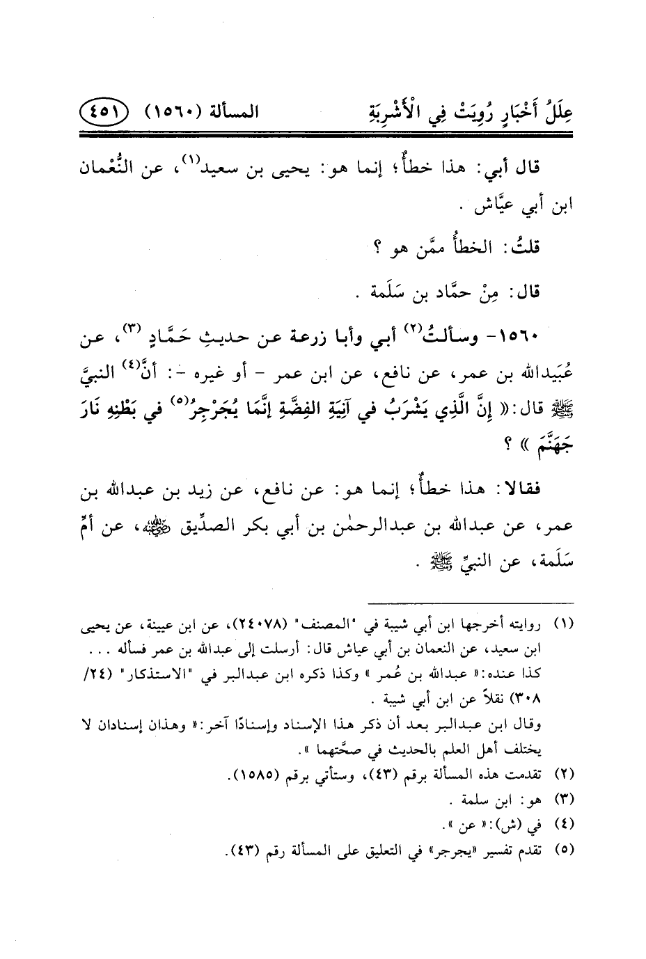 ١٥٦٠- وسألتُ (٢) أَبِي وَأَبَا زُرْعَةَ عَنْ حديثِ حَمَّادٍ (٣) ، عن عُبَيدالله بْنِ عُمَرَ، عَنْ نَافِعٍ، عَنِ ابْنِ عُمَرَ - أو غيره -: أنَّ (٤) النبيَّ (ص) قَالَ: إِنَّ الَّذِي يَشْرَبُ فِي آنِيَةِ الفِضَّةِ إنَّمَا يُجَرْجِرُ (٥) فِي بَطْنِهِ نَارَ جَهَنَّمَ؟
