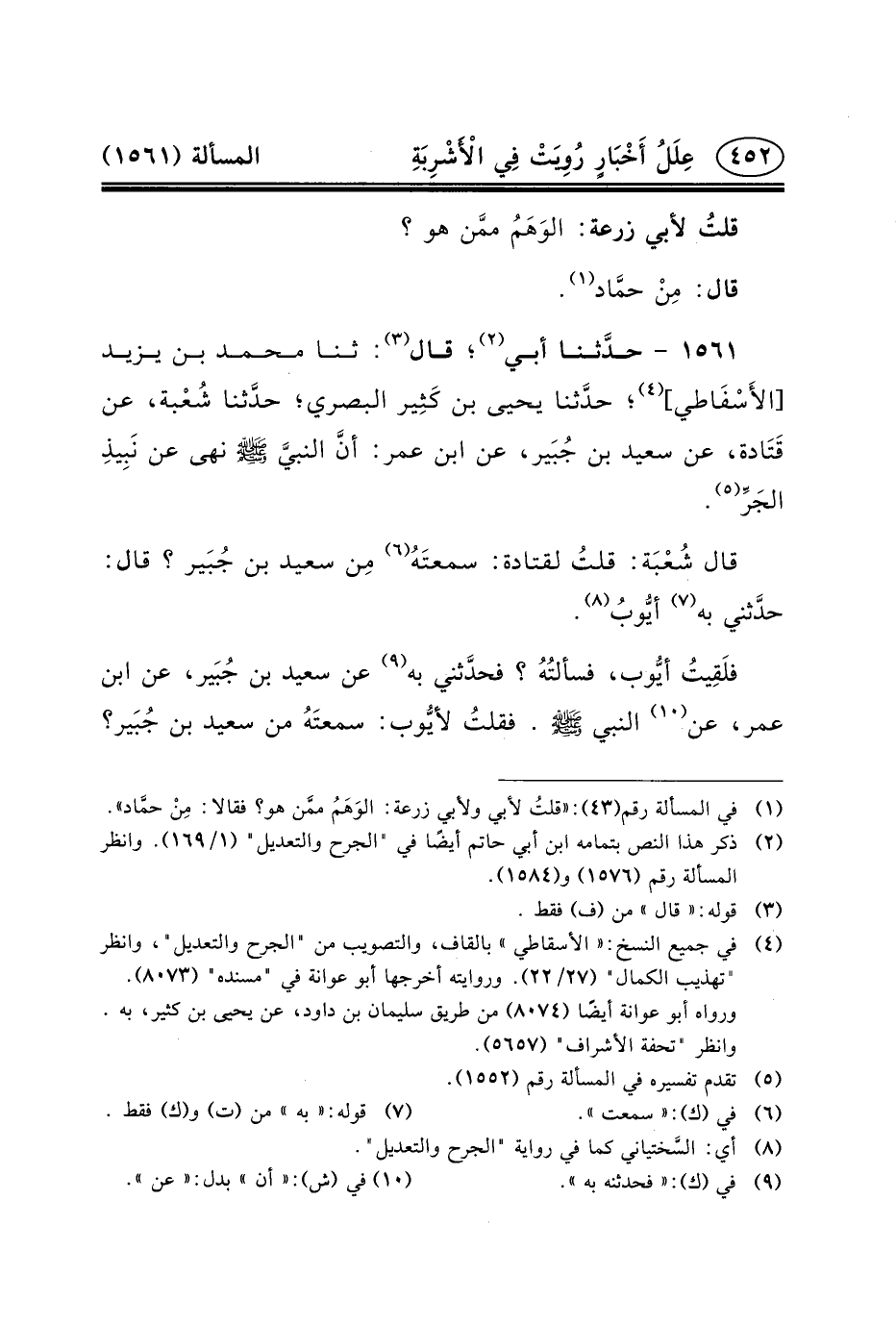 فلَقِيتُ أيُّوب، فسألتُهُ؟ فحدَّثني بِهِ (٩) عَنْ سَعِيدِ بْنِ جُبَير، عَنِ ابن عمر، عن (١٠) النبي (ص) . فقلتُ لأيُّوب: سمعتَهُ مِنْ سَعِيدِ بْنِ جُبَير؟