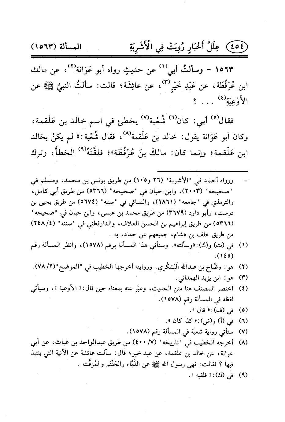 ١٥٦٣ - وسألتُ أَبِي (١) عَنْ حديثٍ رَوَاهُ أَبُو عَوَانة (٢) ، عَنْ مَالِكِ بْنِ عُرْفُطَة، عَنْ عَبْدِ خَيْرٍ (٣) ، عَن عائِشَة؛ قالت: سألتُ النبيَّ (ص) عَنِ الأَوْعِيَةِ (٤) ... ؟