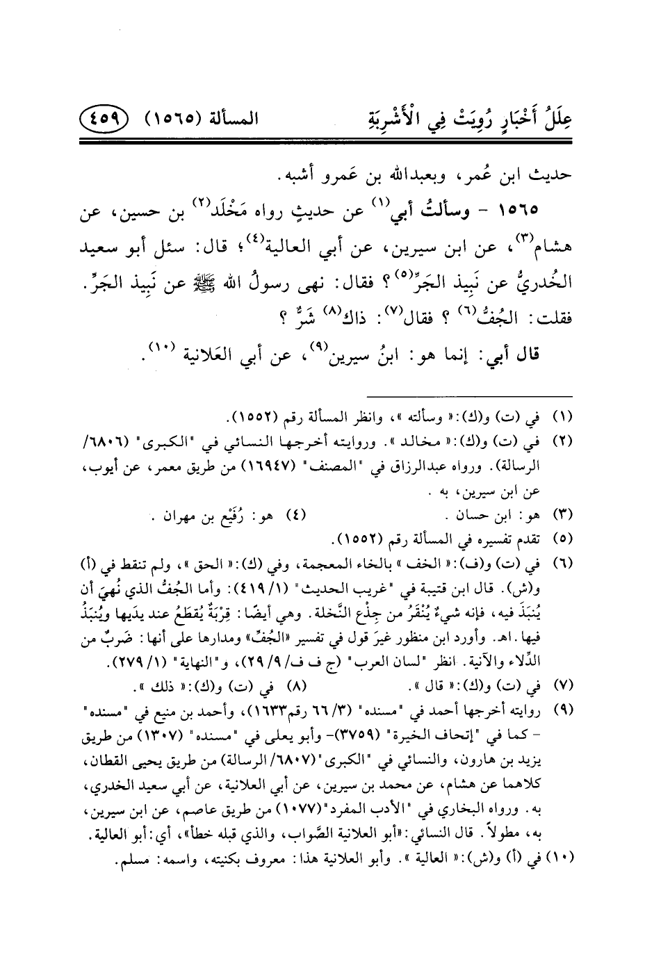 ١٥٦٥ - وسألتُ أَبِي (١) عَنْ حديثٍ رَوَاهُ مَخْلَد (٢) بْنُ حُسَيْنٍ، عَنْ هِشَامٍ (٣) ، عَنِ ابْنِ سِيرِينَ، عَنْ أَبِي الْعَالِيَةِ (٤) ؛ قَالَ: سُئِلَ أَبُو سَعِيدٍ الخُدريُّ عَنْ نَبِيذ الجَرِّ (٥) ؟ فَقَالَ: نَهَى رسولُ اللَّهِ (ص) عن نَبِيذ الجَرِّ. فقلت: الجُفُّ (٦) ؟ فقال (٧) : ذَاكَ (٨) شَرٌّ؟