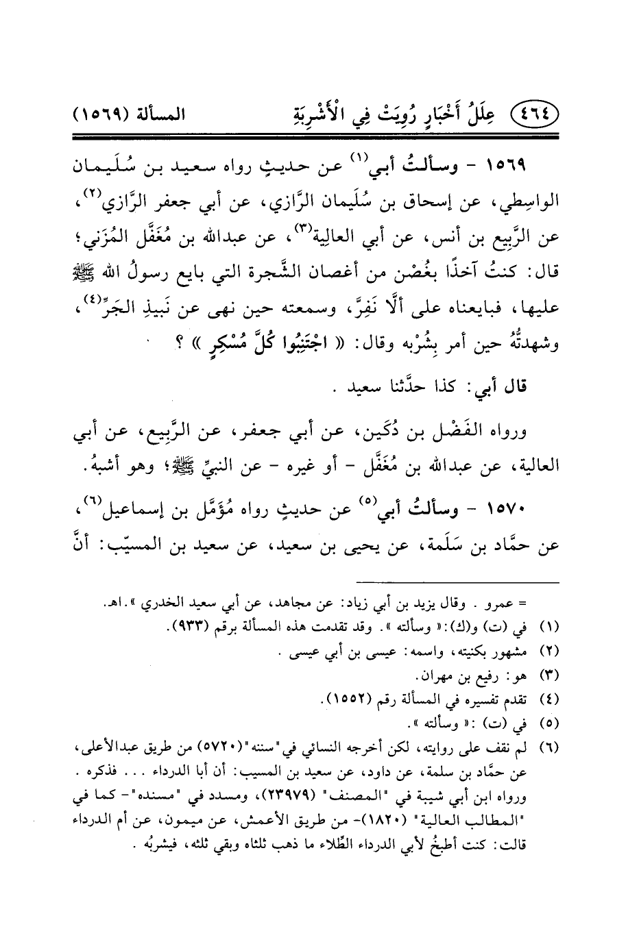 ١٥٦٩ - وسألتُ أَبِي (١) عَنْ حديثٍ رَوَاهُ سَعِيدُ بْنُ سُلَيمان الواسِطي، عَنْ إِسْحَاقَ بْنِ سُلَيمان الرَّازي، عَنِ أَبِي جَعْفَرٍ الرَّازي (٢) ، عَنِ الرَّبِيع بْنِ أَنَسٍ، عَنْ أَبِي العالِية (٣) ، عن عبد الله بْنِ مُغَفَّل المُزَني؛ قَالَ: كنتُ آخِذًا بغُصْن مِنْ أَغْصَانِ الشَّجرة التي بايع رسولُ الله (ص) عليها، فبايعناه على ألَاّ نَفِرَّ، وَسَمِعْتُهُ حِينَ نَهَى عَنْ نَبيذِ الجَرِّ (٤) ، وشهدتُّهُ حِينَ أَمَرَ بِشُرْبه وَقَالَ: اجْتَنِبُوا كُلَّ مُسْكِرٍ؟