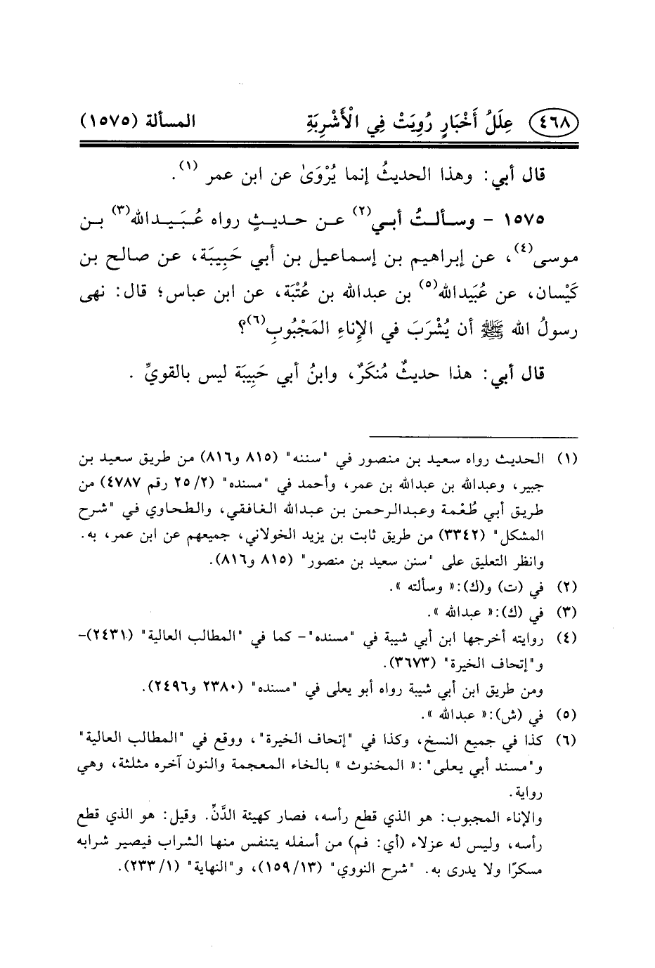 ١٥٧٥ - وسألتُ أبي (٢) عن حديثٍ رواه عُبَيدالله (٣) بن موسى (٤) ، عَنْ إِبْرَاهِيمَ بْنِ إِسْمَاعِيلَ بْنِ أَبِي حَبِيبَة، عَنْ صالح بن كَيْسان، عن عُبَيدالله (٥) بن عبد الله بْنِ عُتْبَة، عَنِ ابْنِ عَبَّاسٍ؛ قال: نهى رسولُ الله (ص) أَنْ يُشْرَبَ فِي الإِناءِ المَجْبُوبِ (٦) ؟