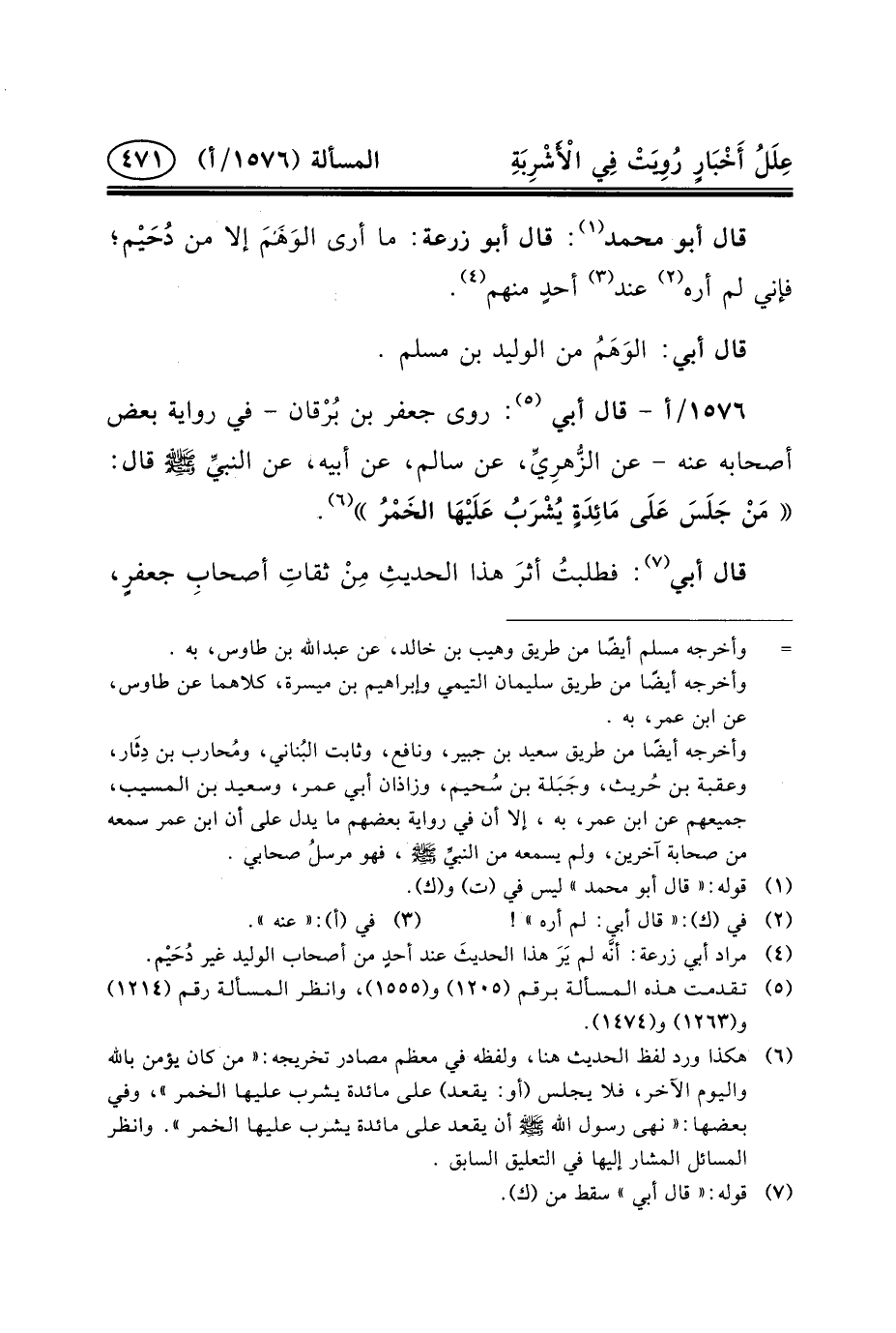 ١٥٧٦/أ - قَالَ أَبِي (٥) : رَوَى جَعْفَرُ بْنُ بُرْقان - فِي رِوَايَةِ بَعْضِ أَصْحَابِهِ عَنْهُ - عَنِ الزُّهرِيِّ، عَنْ سَالِمٍ، عن أبيه، عن النبيِّ (ص) قَالَ: مَنْ جَلَسَ عَلَى مَائِدَةٍ يُشْرَبُ عَلَيْهَا الخَمْرُ (٦) .