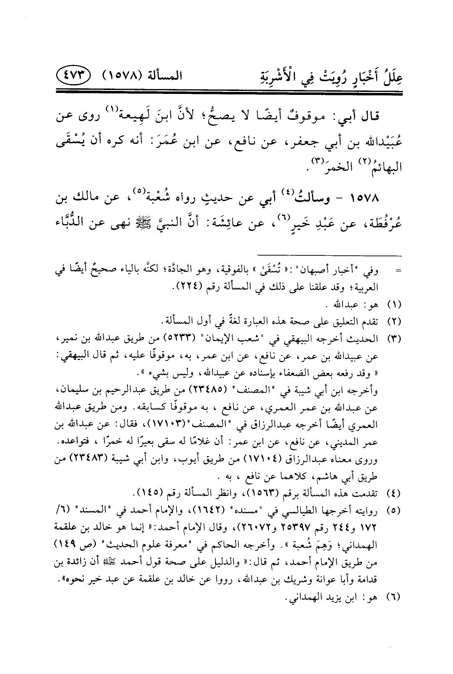 ١٥٧٨ - وسألتُ (٤) أَبِي عَنْ حديثٍ رَوَاهُ شُعْبة (٥) ، عَنْ مَالِكِ بْنِ عُرْفُطَة، عَنْ عَبْدِ خَيرٍ (٦) ، عَنْ عائِشَة: أنَّ النبيَّ (ص) نهى عن الدُّبَّاء