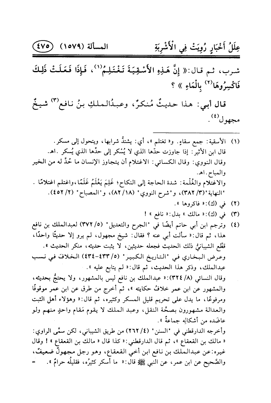 وقال النسائي (٨/٣٢٤) : «عبد الملك بن نافع ليس بالمشهور، ولا يحتجُّ بحديثه، والمشهور عن ابن عمر خلافُ حكايته» ، ثم أخرج من طرق عن ابن عمر موقوفًا ومرفوعًا، ما يدل على تحريم قليل المسكر وكثيره، ثم قال: «وهؤلاء أهل الثبت والعدالة مشهورون بصحَّة النقل، وعبد الملك لا يقوم مَقام واحدٍ منهم ولو عاضَده من أشكالِه جماعةٌ» .