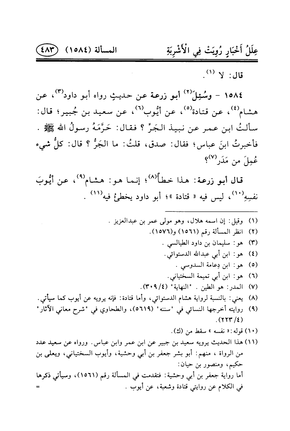 ١٥٨٤ - وسُئِلَ (٢) أَبُو زُرْعَةَ عَنْ حديثٍ رَوَاهُ أَبُو دَاوُدَ (٣) ، عَنْ هِشَامٍ (٤) ، عَنْ قَتَادَةَ (٥) ، عَنْ أيُّوب (٦) ، عَنْ سَعِيدِ بْنِ جُبير؛ قَالَ: سألتُ ابْنَ عُمَرَ عَنِ نَبِيذِ الجَرِّ؟ فَقَالَ: حَرَّمَهُ رسولُ الله (ص) . فأخبرتُ ابنَ عَبَّاسٍ؛ فَقَالَ: صَدَقَ، قلتُ: مَا الجَرُّ؟ قَالَ: كلُّ شَيْءٍ عُمِلَ مِنْ مَدَر (٧) ؟