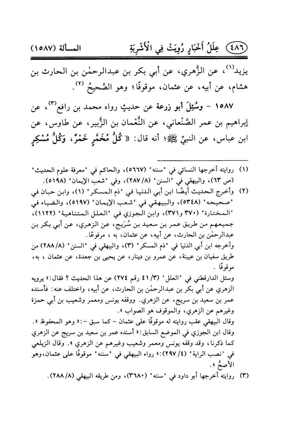 ١٥٨٧ - وسُئِلَ أبو زرعة عَنْ حديثٍ رَوَاهُ مُحَمَّدُ بْنُ رَافِعٍ (٣) ، عَنْ إِبْرَاهِيمَ بْنِ عُمَرَ الصَّنْعاني، عن النُّعْمان بن الزُّبير، عَنْ طَاوُسٍ، عَنِ ابْنِ عباس، عن النبيِّ (ص) ؛ أَنَّهُ قَالَ: كُلُّ مُخَمَّرٍ خَمْرٌ، وَكُلُّ مُسْكِرٍ