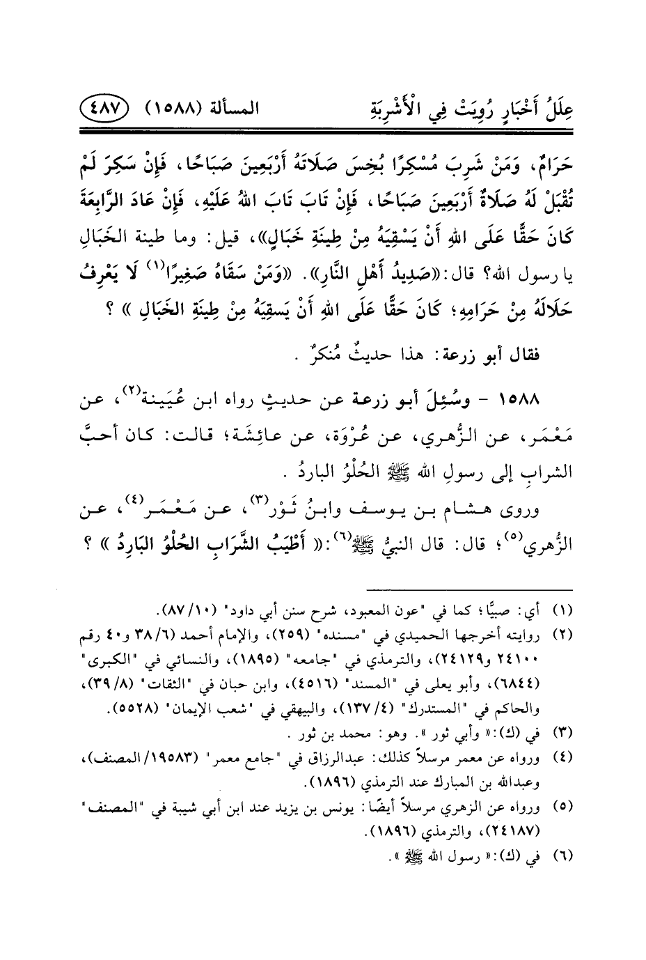 ١٥٨٨ - وسُئِلَ أَبُو زُرْعَةَ عَن حديثٍ رَوَاهُ ابْنُ عُيَينة (٢) ، عَنْ مَعْمَر، عَنِ الزُّهري، عَنْ عُرْوَة، عَنْ عائِشَة؛ قَالت: كَانَ أحبَّ الشرابِ إِلَى رسولِ اللَّهِ (ص) الحُلْوُ الباردُ.