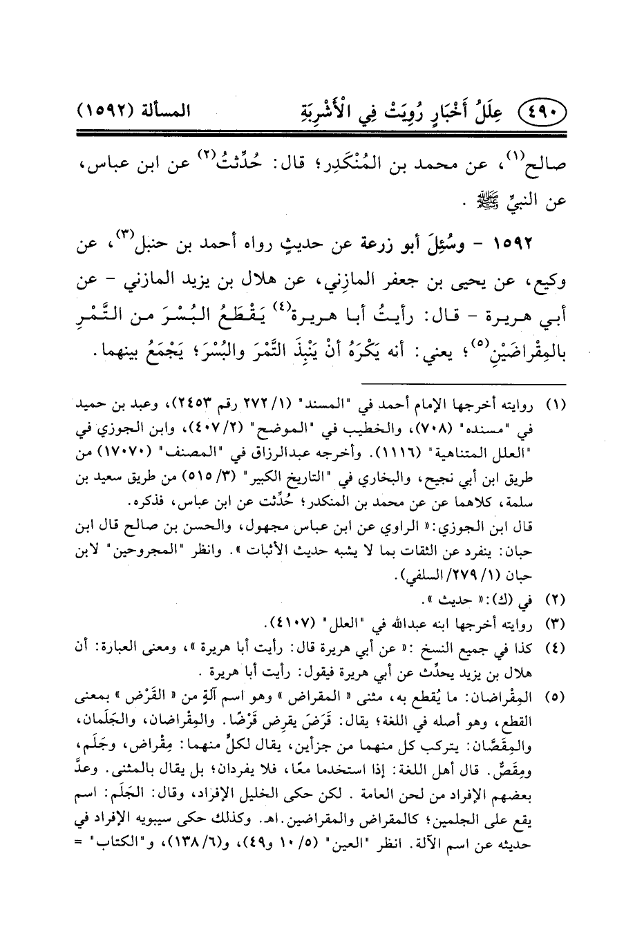 ١٥٩٢ - وسُئِلَ أَبُو زُرْعَةَ عَنْ حديثٍ رَوَاهُ أَحْمَدُ بْنُ حَنْبَلٍ (٣) ، عَنْ وَكِيعٍ، عَنْ يَحْيَي بْنِ جَعْفَرٍ المازِني، عَنْ هِلالِ بْنِ يَزِيدَ الْمَازِنِيِّ - عَنْ أَبِي هُرَيْرَةَ - قَالَ: رأيتُ أَبَا هُرَيْرَةَ (٤) يَقْطَعُ البُسْرَ مِنَ التَّمْرِ بالمِقْراضَيْنِ (٥) ؛ يَعْنِي: أَنَّهُ يَكْرَهُ أنْ يَنْبِذَ التَّمْرَ والبُسْرَ؛ يَجْمَعُ بينهما.