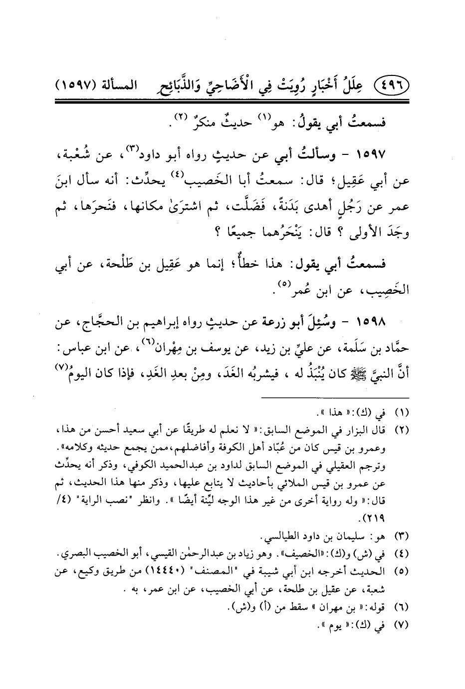١٥٩٧ - وسألتُ أَبِي عَنْ حديثٍ رَوَاهُ أَبُو دَاوُدَ (٣) ، عَنْ شُعْبة، عَنْ أَبِي عَقِيل؛ قَالَ: سمعتُ أَبَا الخَصيب (٤) يحدِّث: أَنَّهُ سَأَلَ ابنَ عُمَرَ عَنْ رَجُلٍ أَهْدَى بَدَنةً، فَضَلَّت، ثُمَّ اشترَى مَكَانَهَا، فنَحرَها، ثُمَّ وجَدَ الأُولَى؟ قَالَ: يَنْحَرُهما جَمِيعًا؟
