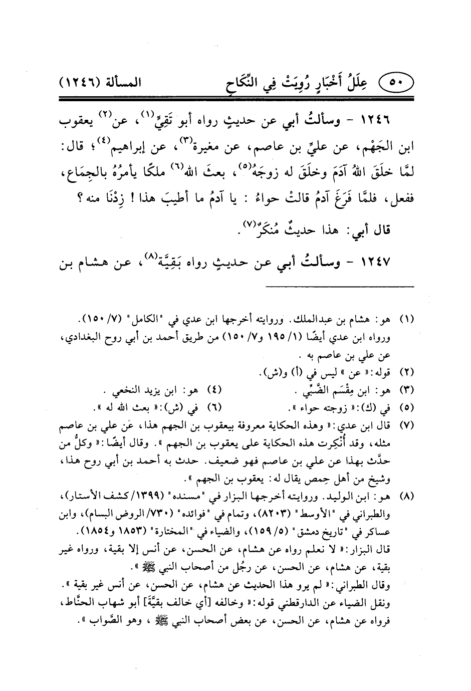١٢٤٦ - وسألتُ أَبِي عَنْ حديثٍ رَوَاهُ أبو تَقِيٍّ (١) ، عن (٢) يَعْقُوبُ بْنُ الجَهْم، عَنْ عليِّ بْنِ عَاصِمٍ، عَنْ مُغِيرَةَ (٣) ، عَنْ إِبْرَاهِيمَ (٤) ؛ قَالَ: لمَّا خلَقَ اللهُ آدَمَ وخلَقَ له زوجَهُ (٥) ، بعثَ اللَّهُ (٦) مَلَكًا يأمرُهُ بالجِمَاع، فَفَعَلَ، فلمَّا فَرَغَ آدمُ قالتْ حواءُ: يَا آدمُ مَا أطيبَ هَذَا! زِدْنَا مِنْهُ؟