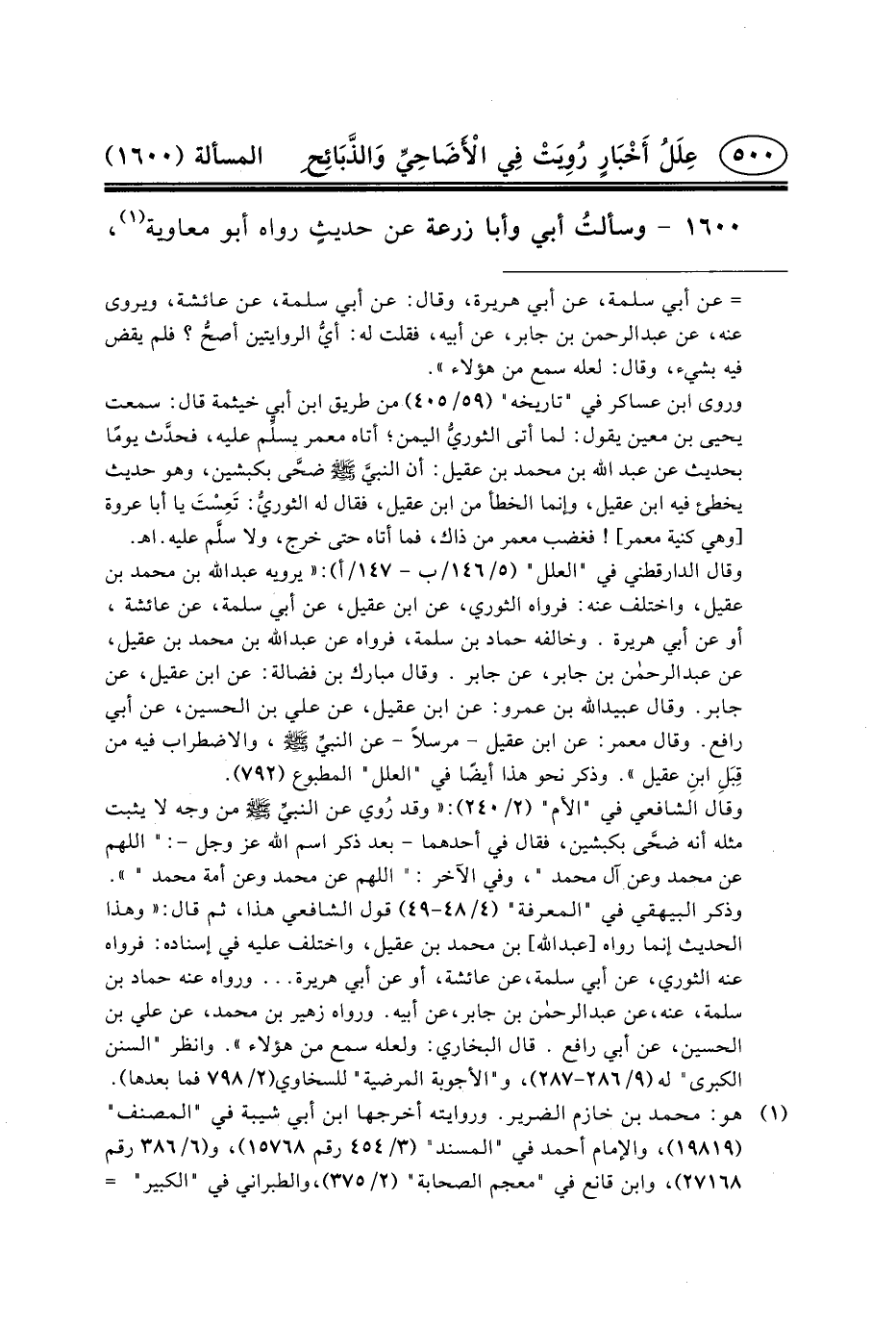 ١٦٠٠ - وسألتُ أَبِي وَأَبَا زُرْعَةَ عَنْ حديثٍ رواه أبو معاوية (١) ،