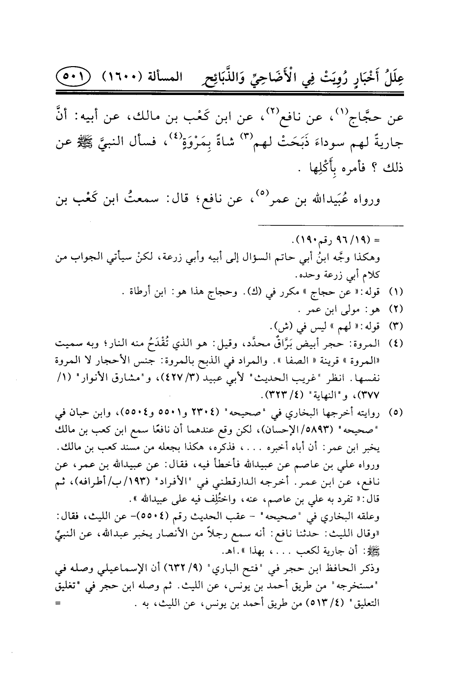 عَنْ حجَّاج (١) ، عَنْ نَافِعٍ (٢) ، عَنِ ابْنِ كَعْب بْنِ مَالِكٍ، عَنْ أَبِيهِ: أنَّ جَارِيَةً لَهُمْ سوداءَ ذَبَحَتْ لَهُمْ (٣) شَاةً بِمَرْوَةٍ (٤) ، فَسَأَلَ النبيَّ (ص) عَنْ ذَلِكَ؟ فَأَمَرَهُ بِأَكْلِها.