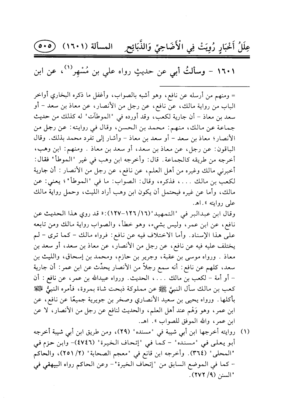 ١٦٠١ - وسألتُ أَبِي عَنْ حديثٍ رَوَاهُ علي ابن مُسْهِر (١) ، عن ابن
